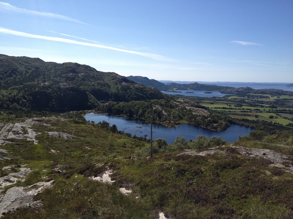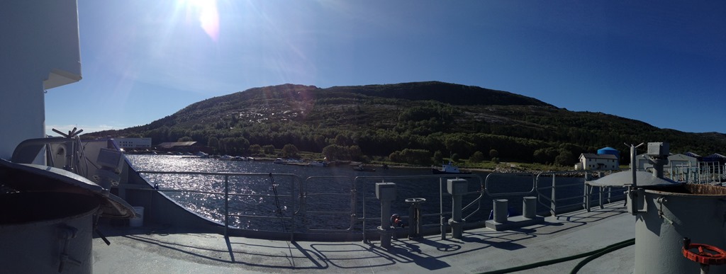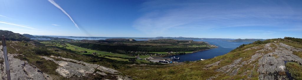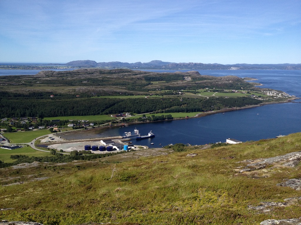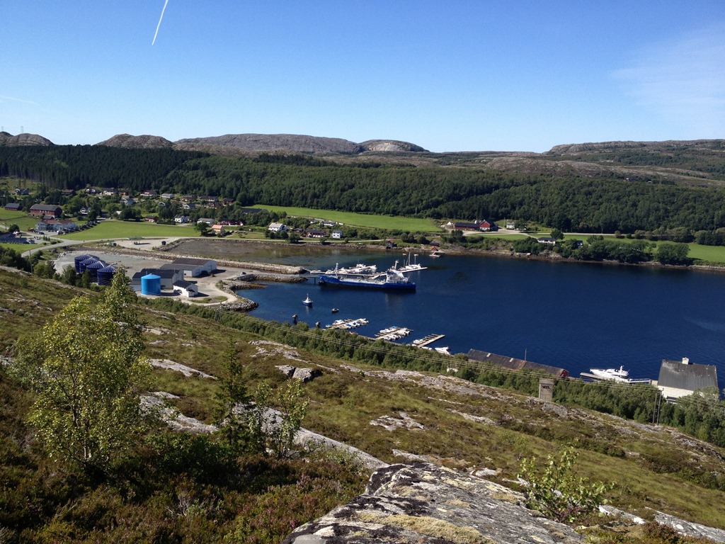 Efter lossningen så äter vi olika sorters fisk. Jag äter stekt makrill, Bernt äter stekt torskfile och de andra äter spekesild. Torsken och makrillen är fisk som jag fångade igår när vi låg i Lysöysund. När vi ätit klart så vilar vi en stund innan jag och Bernt tänker gå upp på fjälltoppen. Vi tog fel väg upp så Bernt vänder tillbaka ner efter ca 2 km. Men det är fin utsikt härifrån med.