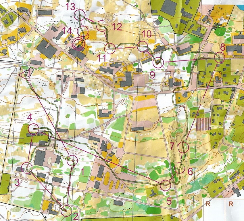 Österut och en bit längs vägen innan jag tog sikte ner mot det öppna parkeringsområde och fältet. Tog kompass mot skyttegropen som låg nordost om det stora huset där 5:an låg.