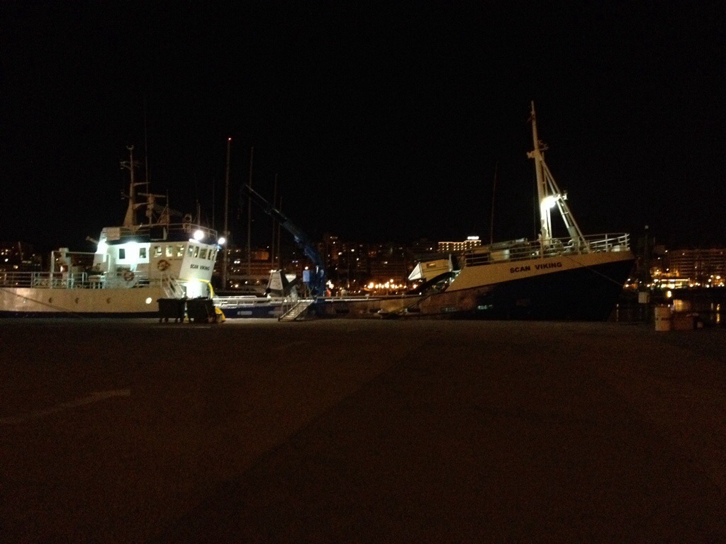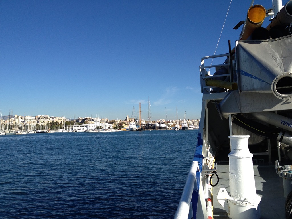 Väl framme så hämtar vi ut våra väskor och tar en taxi till hamnen i Palma. Där ligger båten och väntar på oss i solskenet.