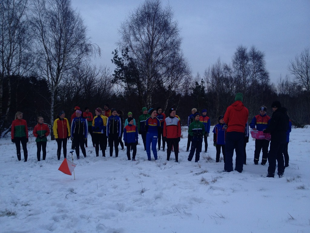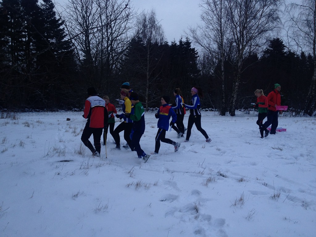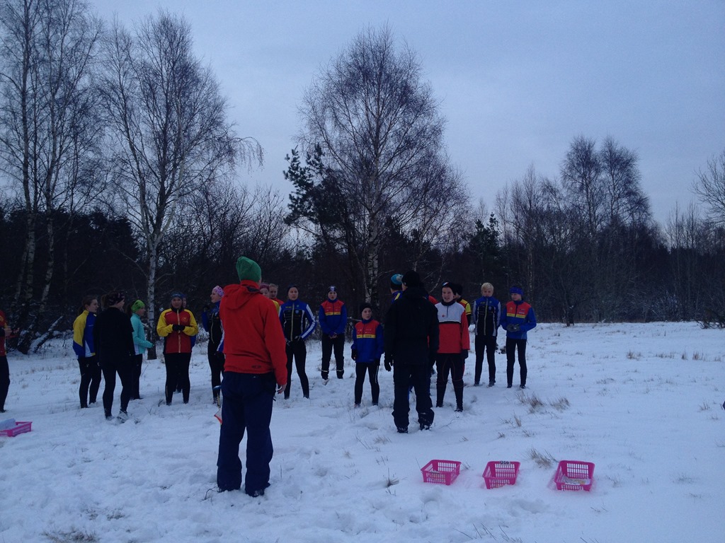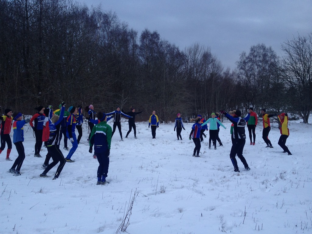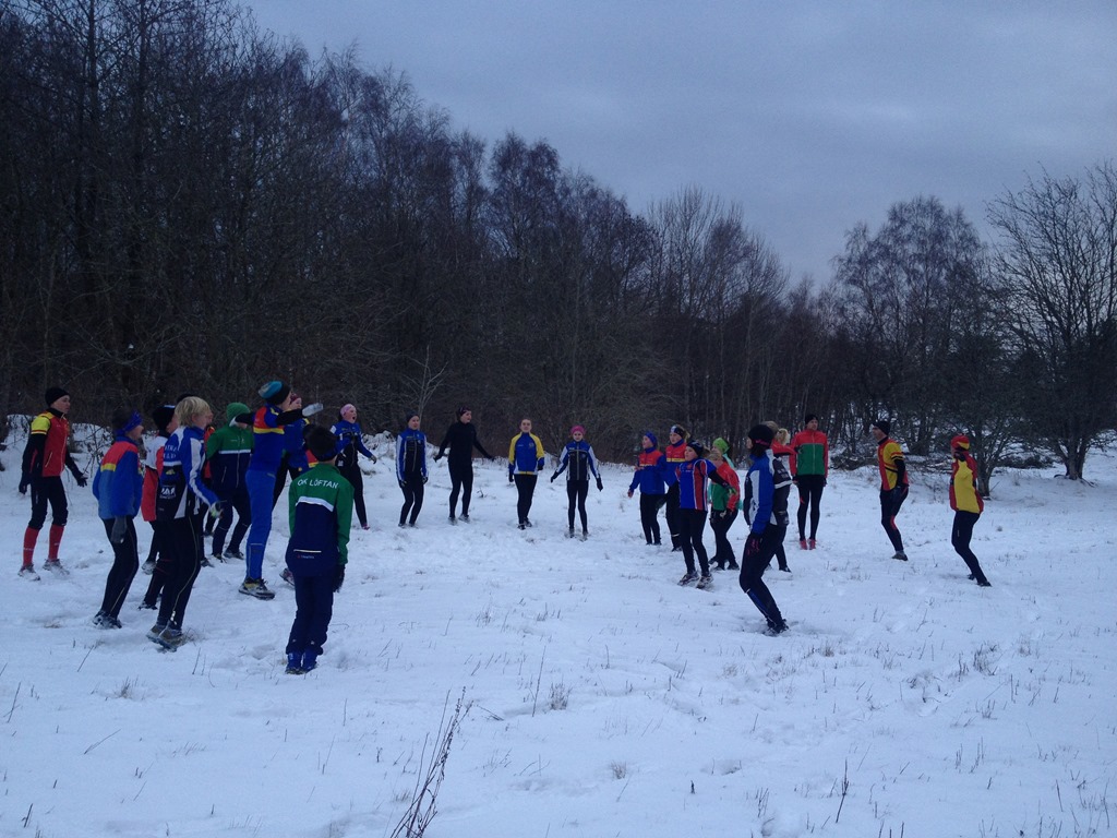 09:00 Åkte upp till Friskusstugan i Varberg för att var med på Hallands OF ungdomsträning. Det snöade och var –2 grader. Det var ca 20 ungdomar som slöt upp och vi joggade gemensamt mot startpunkten innan vi gjorde lite uppvärmning.