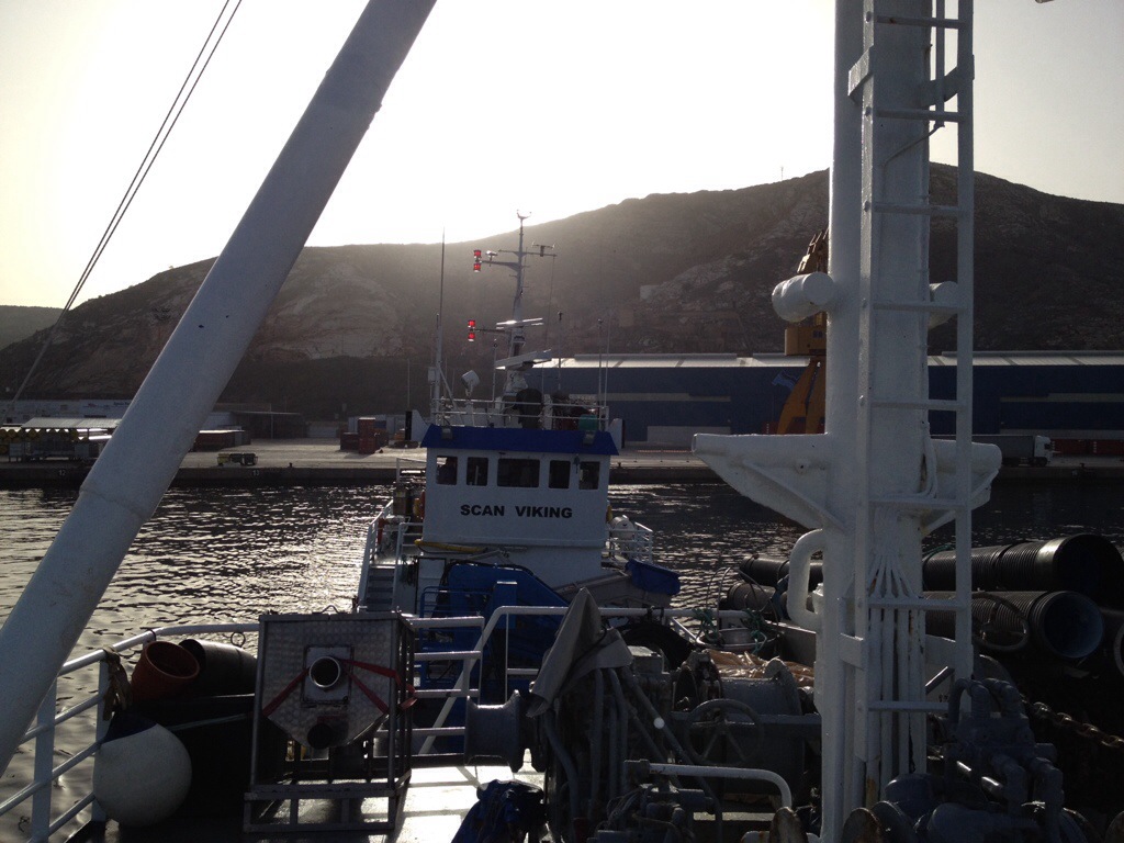 07:00 Vaknar men ligger kvar en stund och läser nyheter på mobilen. Sedan upp och äta frukost. Lastbilen med våra nya losseslangar har kommit. Vi lyfter ombord dem och gör oss klara för avgång.
