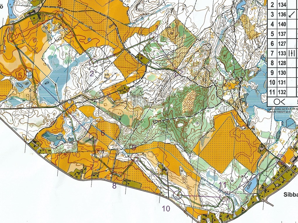 Kompasskurs söderut mot vägen. Framme vid vägen så följde jag den österut svängde av på sydost men drog lite för mycket sydligt. Kom ut på ängen och fick syn på våtmarken och diket vilket jag följde fram till 6:an.