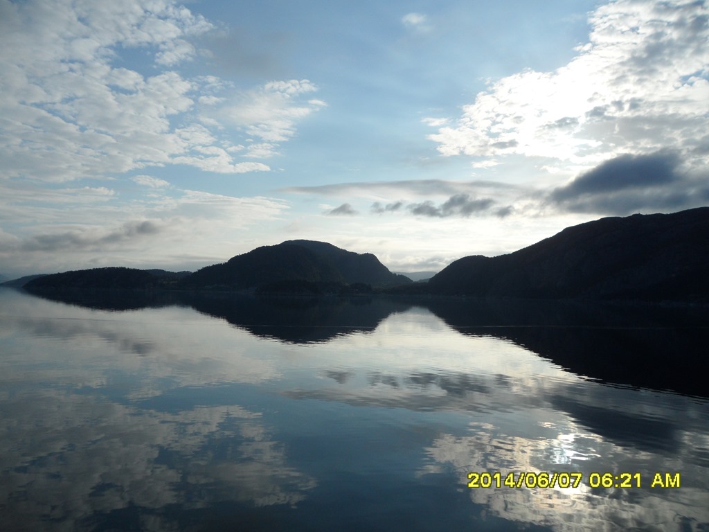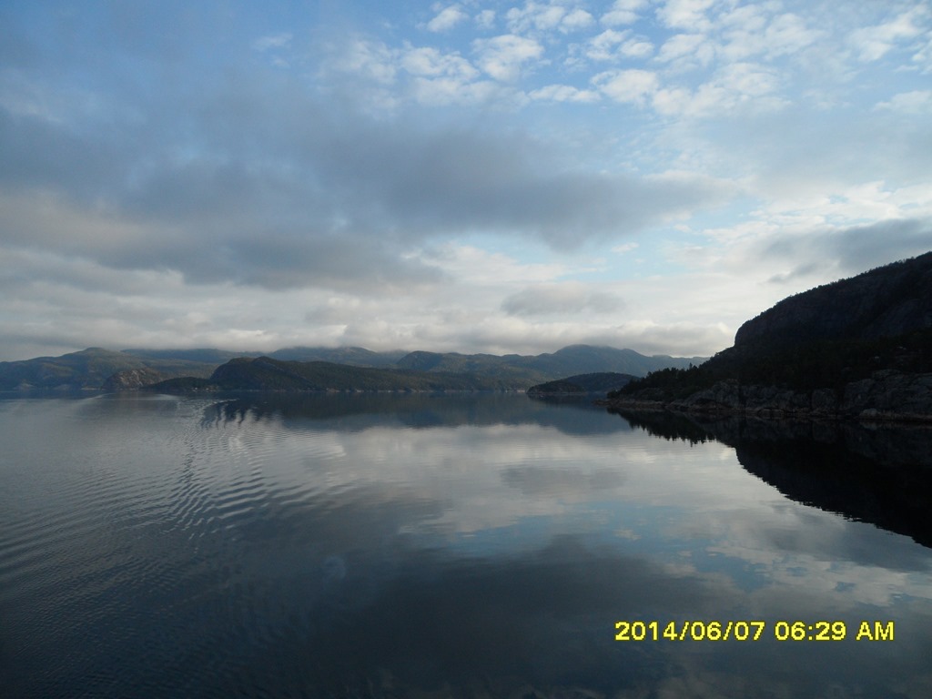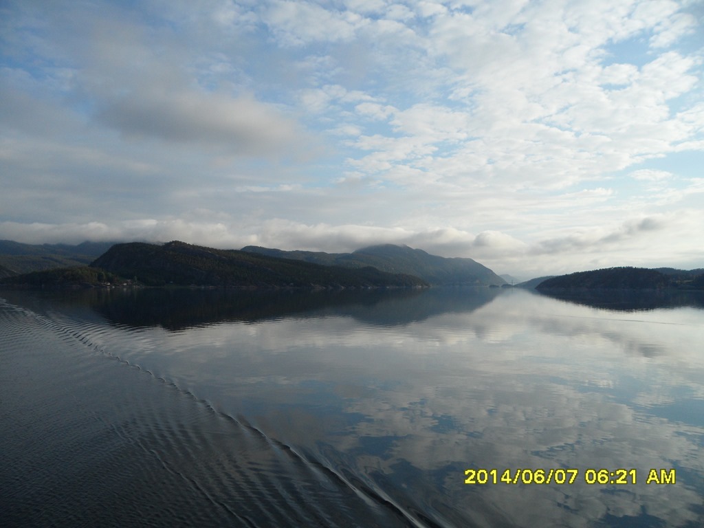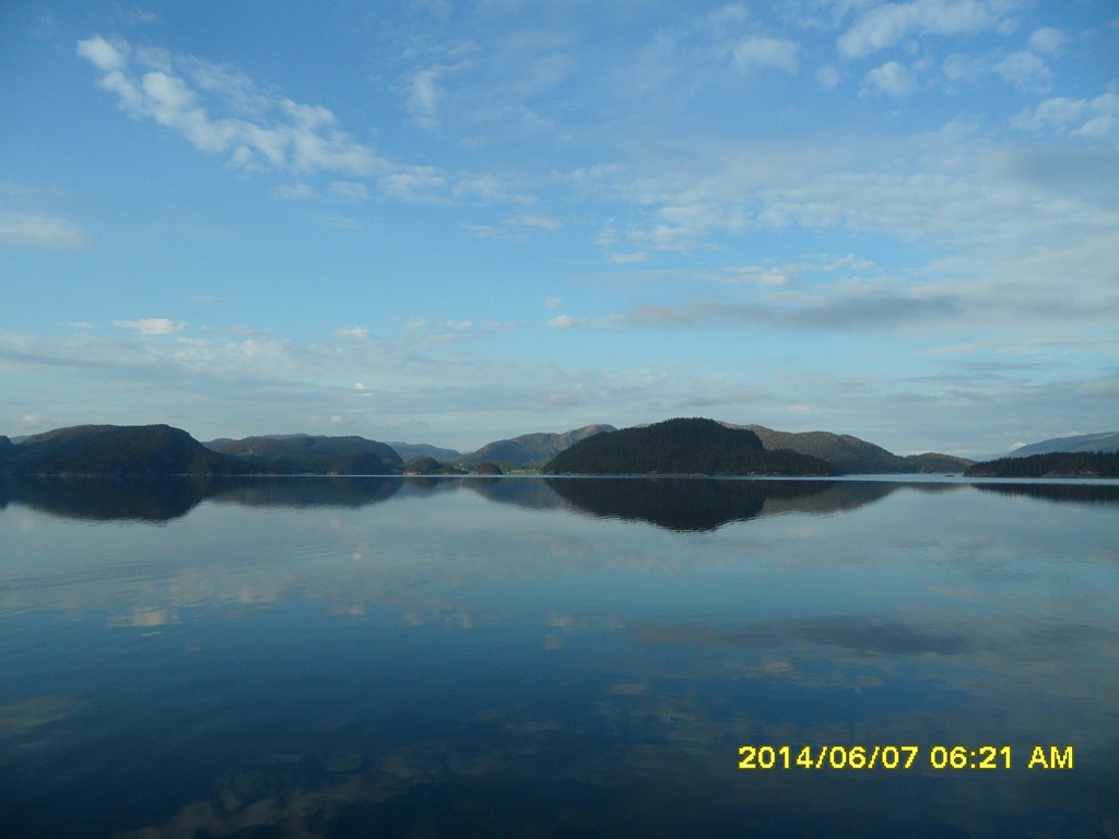 02:00 Kommer på vakt ute på Folda. Vi kör med lite reducerad fart så vi skall vara framme 07:00. Stilla och fint väder +18 grader.