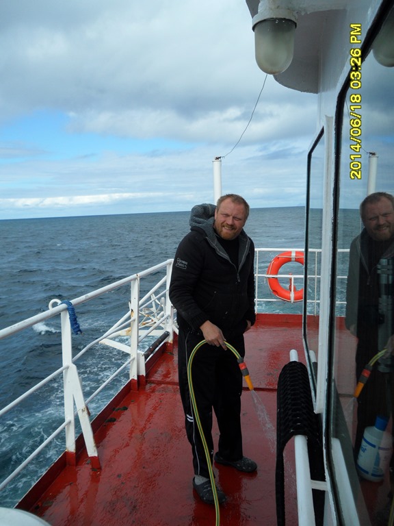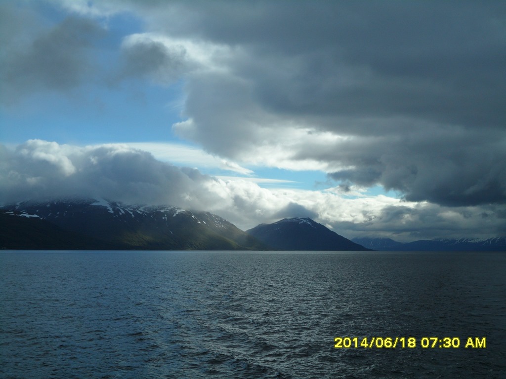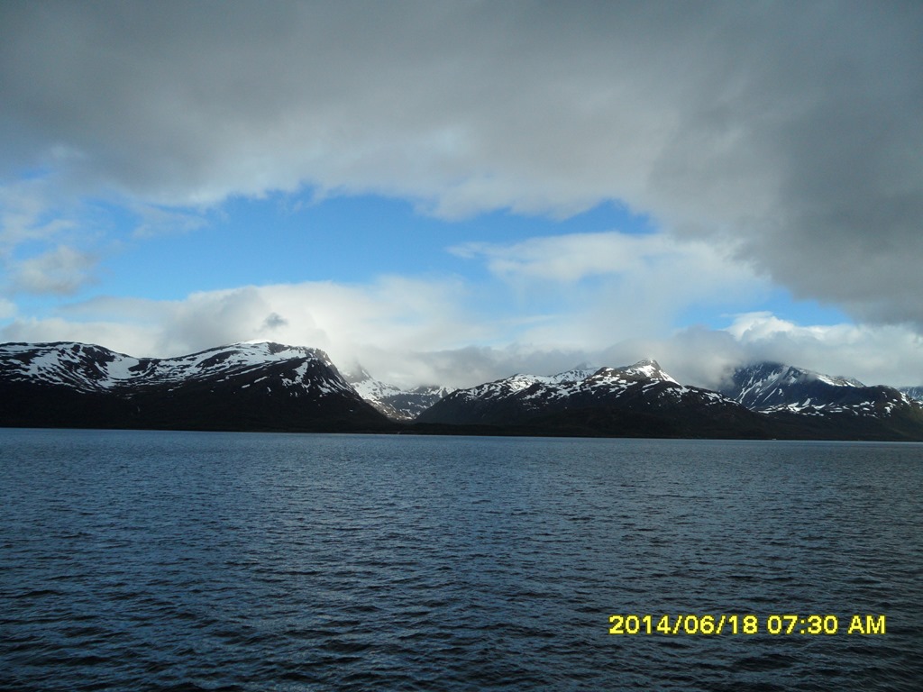 14:00 Kommer på vakt när vi kommit ur Malangen och ut i Norske Havet. Solsken och svag nordlig vind.