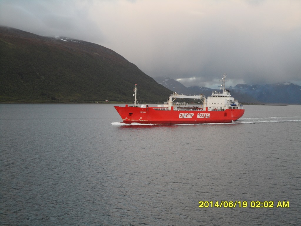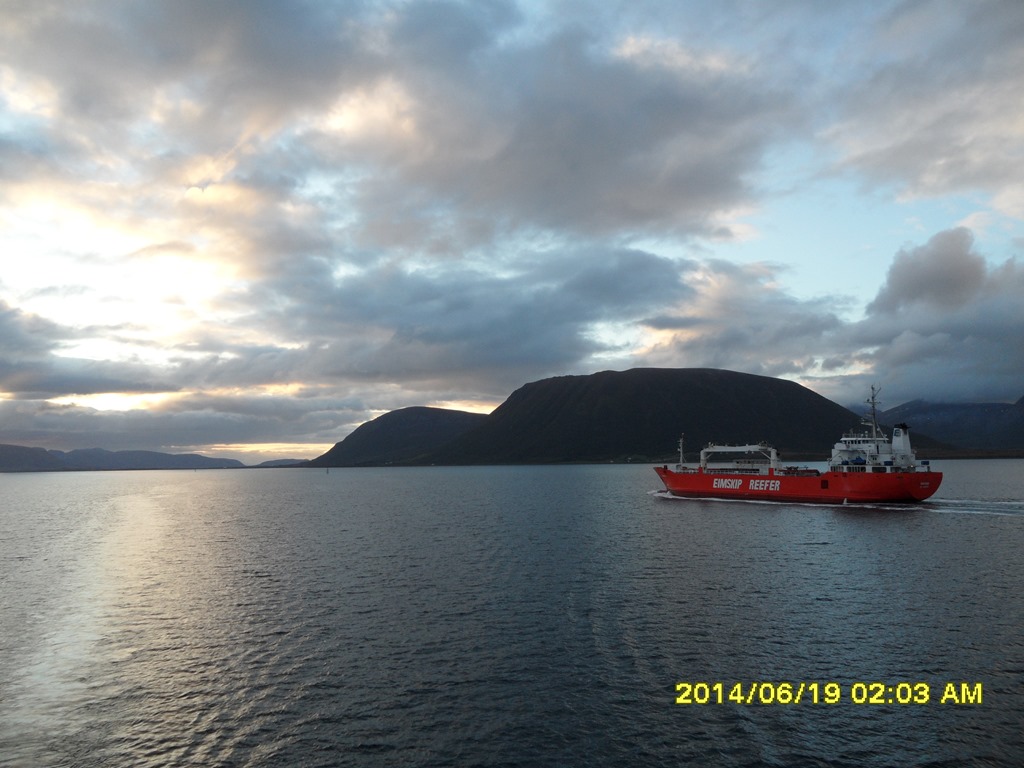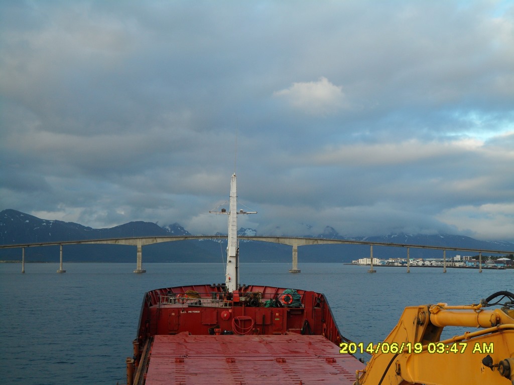 02:00 Kommer på vakt när vi gått igenom Risöyrenna. Vi går med reducerad fart eftersom vi inte kan lasta innan 05:00.