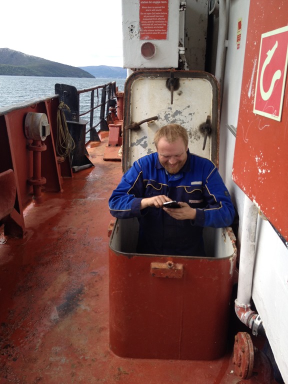 Tar mig en kopp kaffe ute på bryggvingen när vi kommit ut på Vestfjorden.![]()