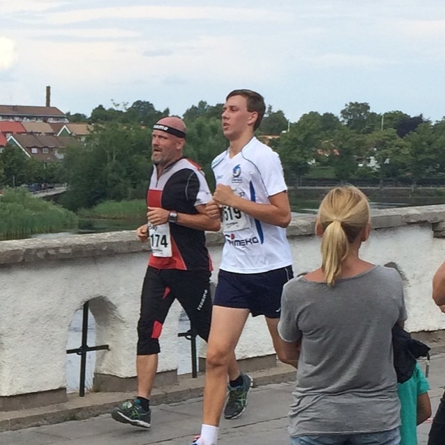 14:00 Starten gick och jag försökte flyta med så bra som möjligt i folkmassan. Det gick inte överdrivet fort och det kändes bra. Vi passerade 5 km efter 23 minuter så det var ingen ny rekordtid för mig på gång. Efter 6,5 km så kände jag av värmen och började gå lite. Sänkte farten lite och joggade på med några kortare gåpauser emellan. När vi passerade vätskan vid 8 km nere vid Laxstugan så ökade jag farten eftersom det var skuggigt och mjukare underlag att springa på. Passerade Tullbron och Britta hejade på mig, men det var ganska jobbigt och jag hade hög puls.