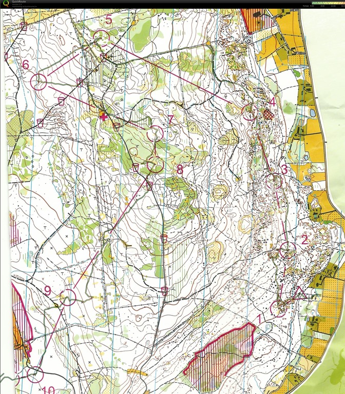 Norrut mot stigen och följa den västerut mot vägen. Norrut på vägen och vid slutet så följde jag stenmuren västerut och uppför. Jobbigt varmt och sakta uppför upp till nästa väg. Upp till vätskan och dricka lite innan jag fortsatte norrut. Såg jakttornen och sprang på öster till gropen och 5:an.
