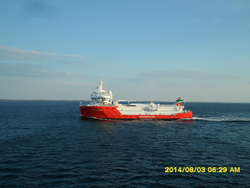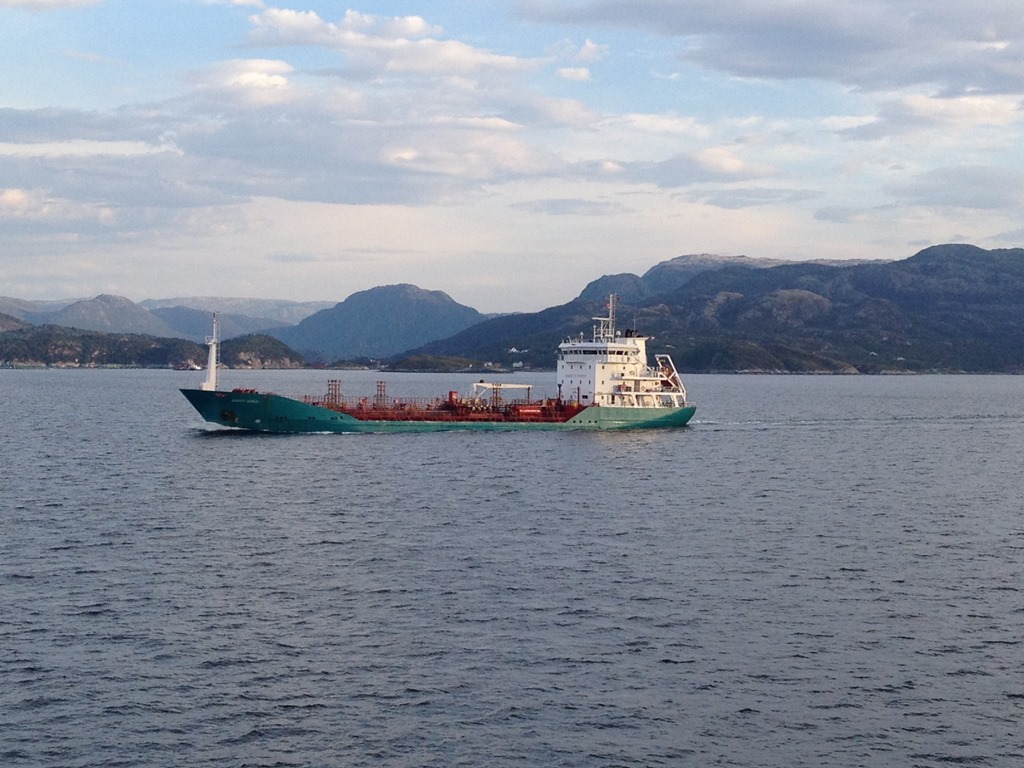20:00 Går av vakten. Efter jag ätit så går jag upp för att skicka iväg lite anlöpspapper till Kristiansund Hamn. Precis innan jag skall gå ner och lägga mig så möter vi min gamla båt Bergen Nordic.