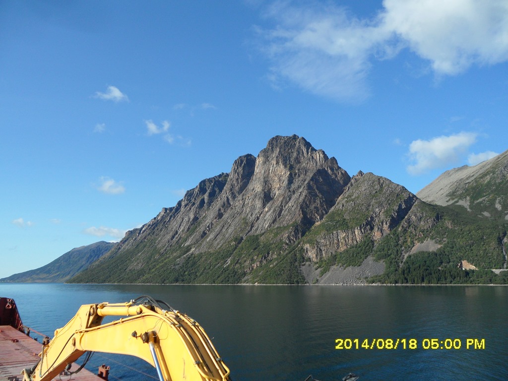 05:30 Avgår från Fjelldal och går sakta över fjorden. När vi har ungefär 100 meter kvar till kajen så får vi bottenkänning. Svajar till lite i båten men vi fortsätter sakta in mot kajen. Men ända fram kommer vi inte utan båten hamnar 2-3 meter från kajen.