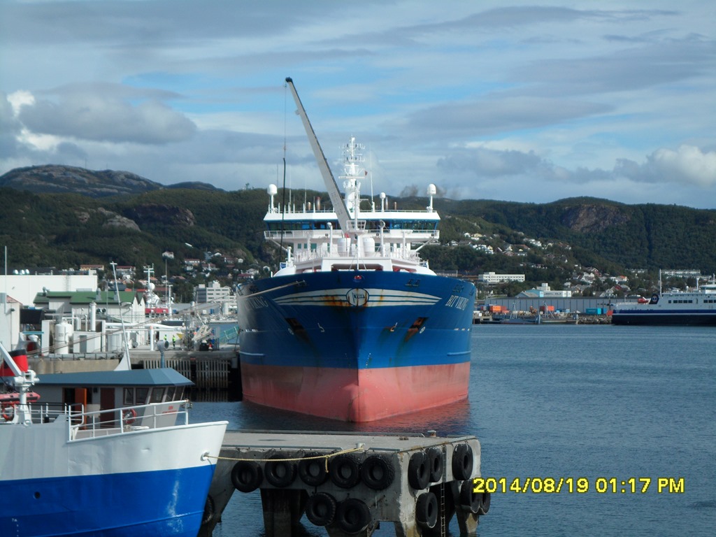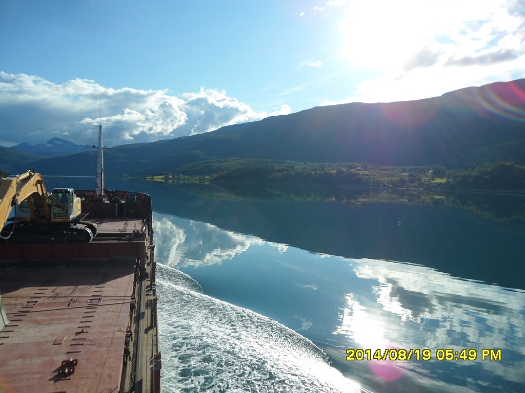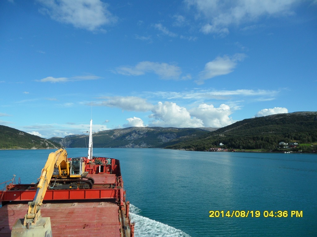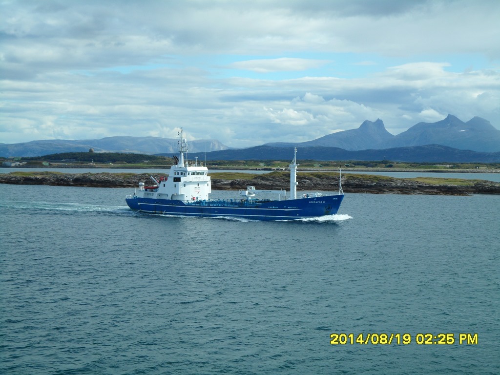 13:55 Färdig lossade och avgår med reducerad fart mot Misvaer innanför Saltstraumen.