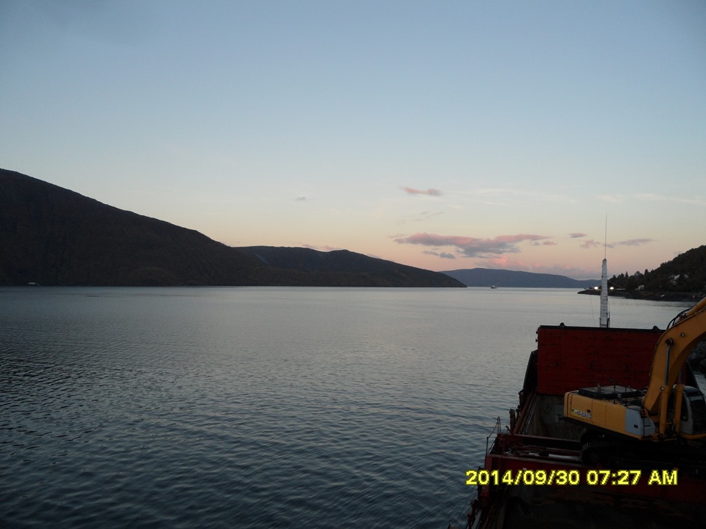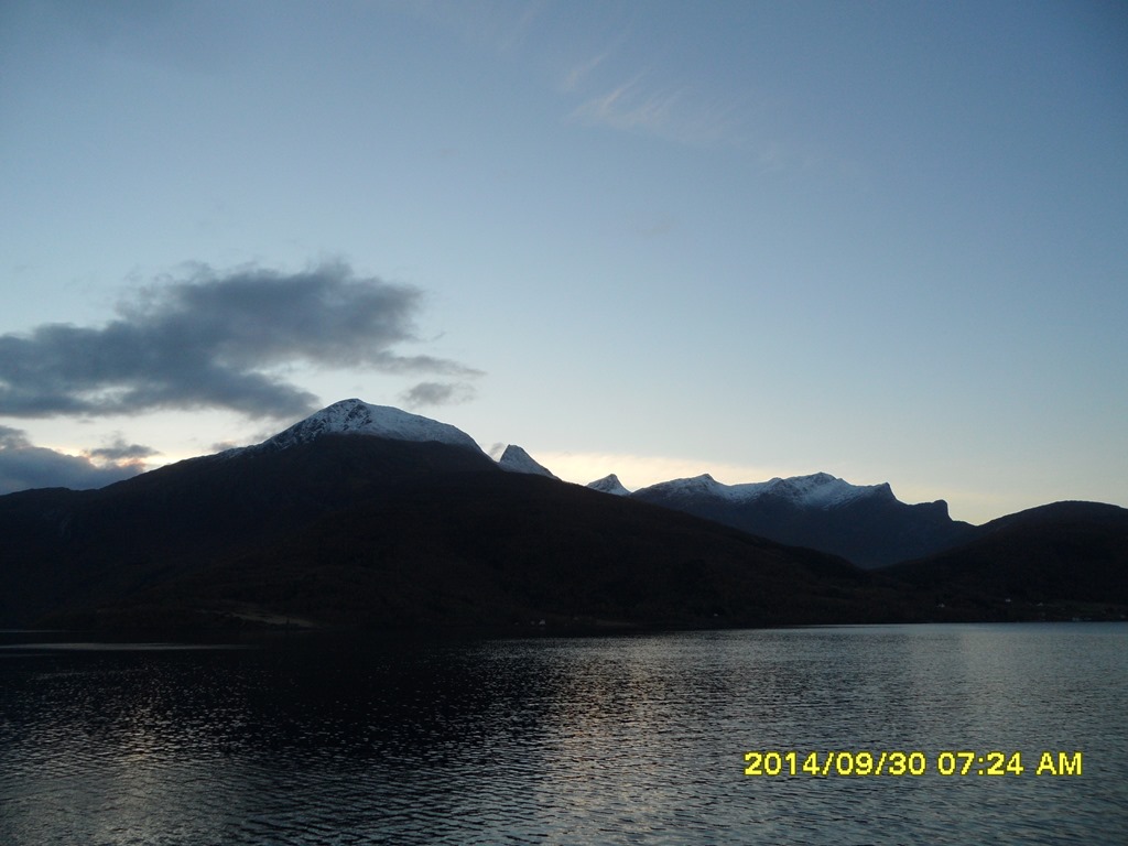02:00 Kommer på vakt och de har stoppat lossningen över natten. Jag ställer mig och börjar rätta sjökort och håller på med detta i stort sett hela natten. Det blir en fin morgon här i Kjöpsvik och man ser att snön har börjat falla uppe i fjällen.
