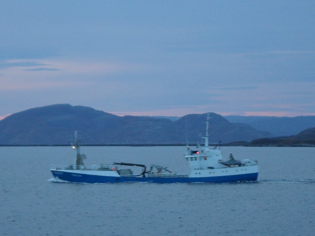 02:00 Kommer på vakt när vi passerar genom Rörvik. Stilla och fint väder och det blir bara lite svag dyning på Folda. Vidare ner genom Ramsöysundet och Bessakersundet.