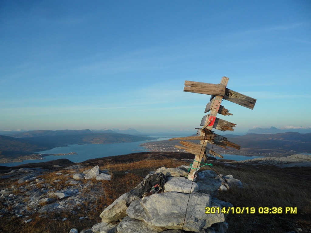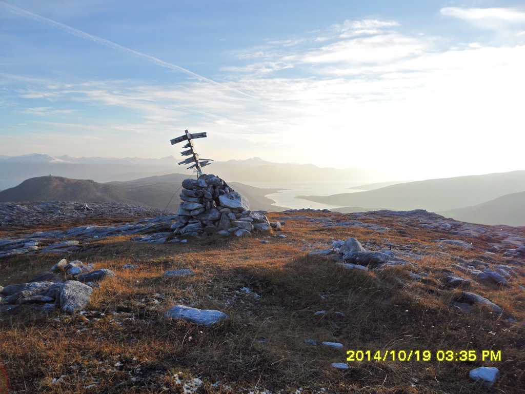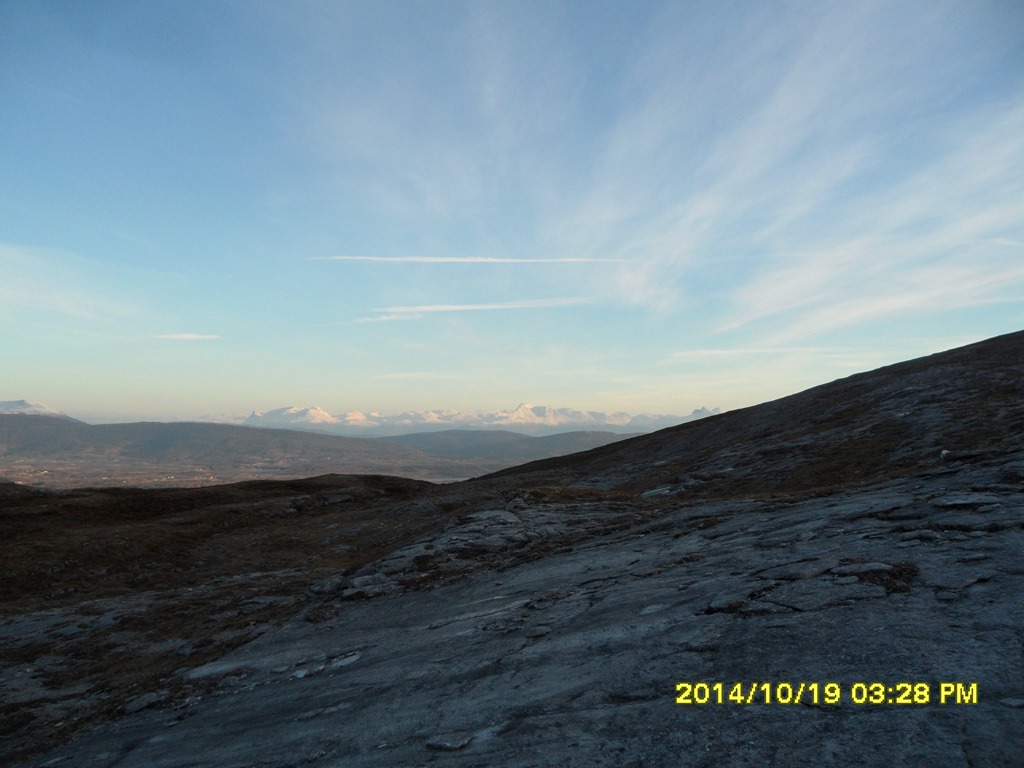Det tog mig 55 minuter de 4,2 km upp till toppen 499möh. Det hade snöat lite här uppe och man ser att det kommit ganska mycket på de högre fjälltopparna.![]()