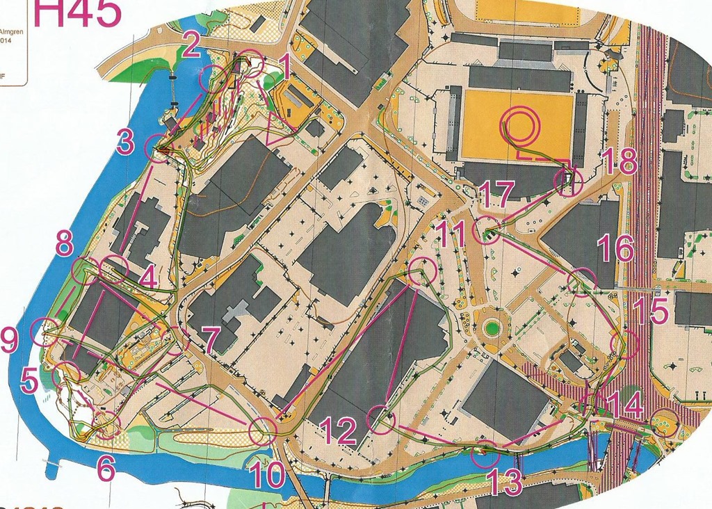 Var ju egentligen bara 100 meter till nästa kontroll och skulle ligga vid slutet av bäcken. Men jag hittade ingen där och sprang runt och tittade på alla andra kontroller. Tillbaka till bäcken och följa den upp igen och till slut så låg den i en grop mellan 2 avloppsrör.