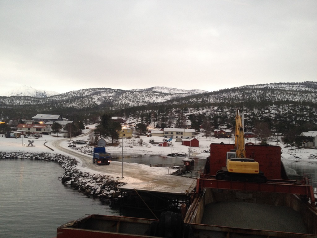 09:00 Förtöjda vid kaj på Innhavet och börjar lossa. Kom in perfekt eftersom det är högvatten om 37 minuter. Lite kallt idag men snön lyser ju upp tillvaron.