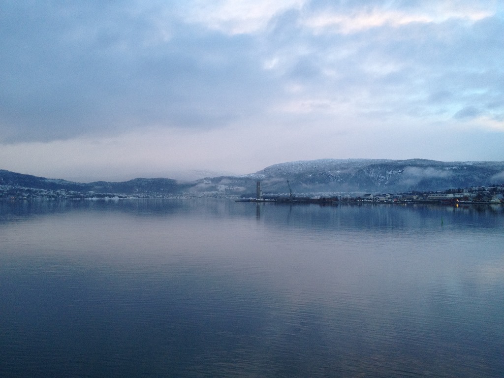 07:30 Kommer ner och äter frukost och dricker kaffe. De har påbörjat lossningen och det är grått och disigt väder ute.