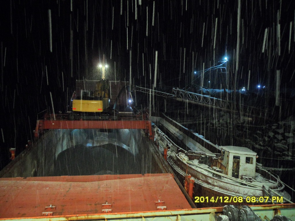 18:30 Blir uppkallad på bryggan för att hjälpa till med förtöjningen. Det är tätt snöfall och väldigt dålig sikt.
