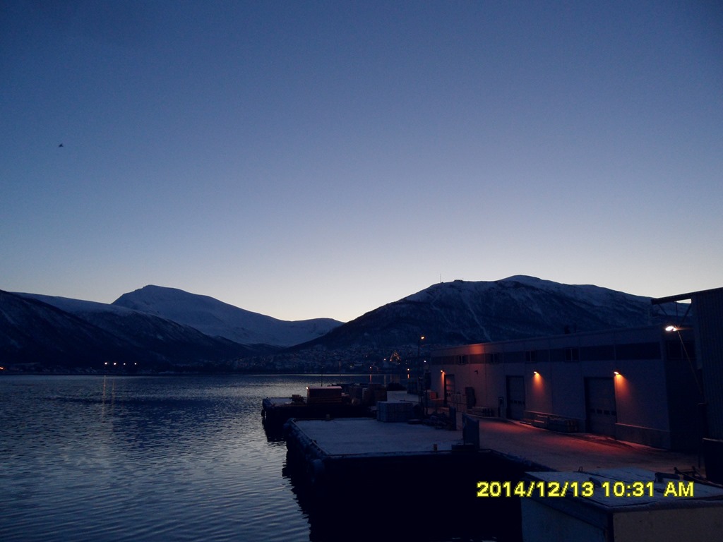 08:55 Förtöjda i Tromsö på en väntekaj.