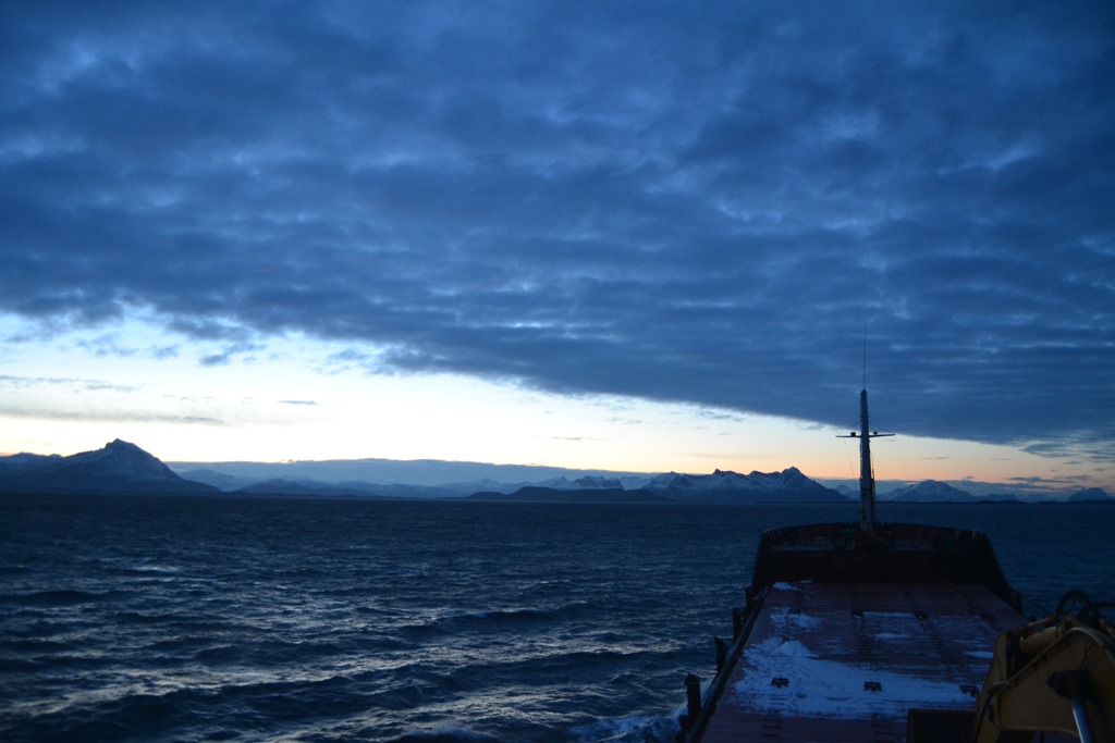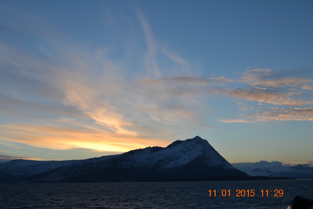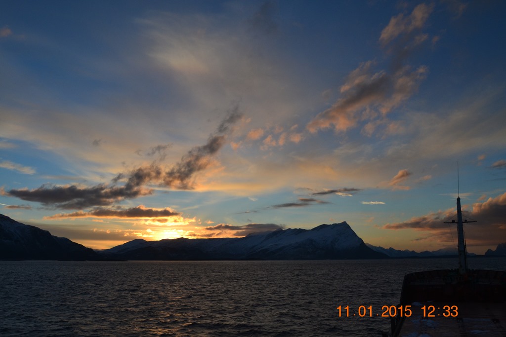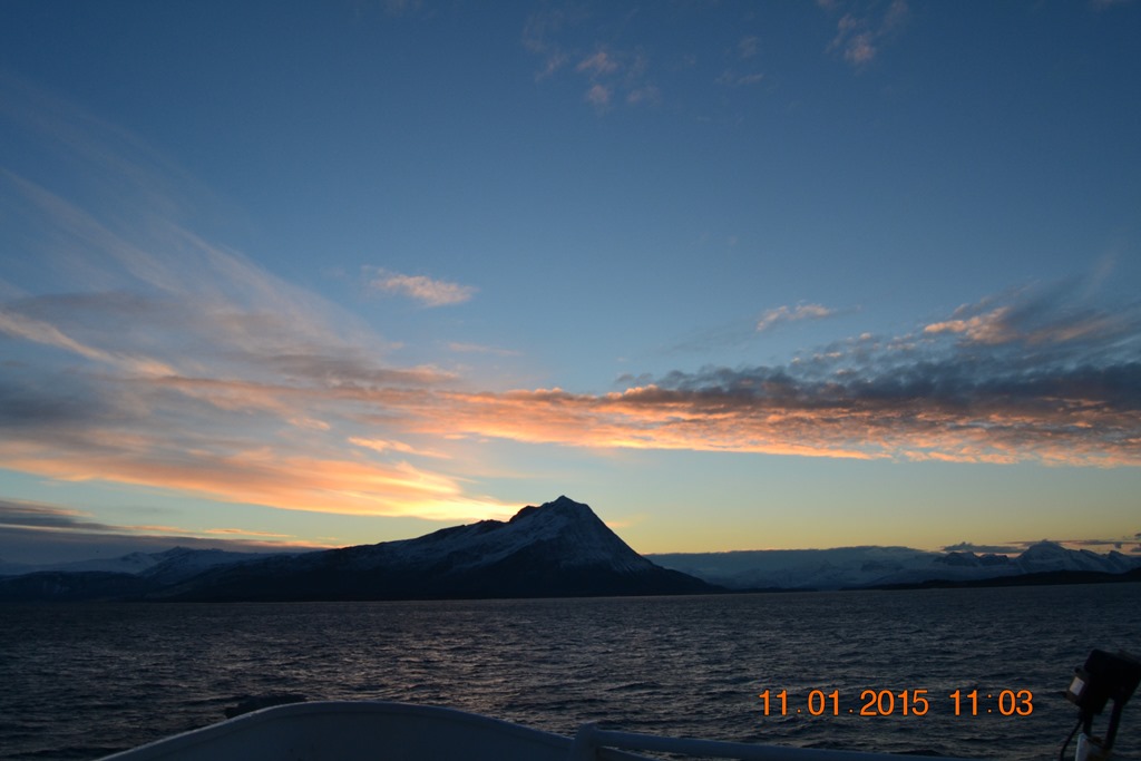 02:00 Går av vakten ute på Vestfjorden och det är riktigt bra väder. –6 grader och Östlig vind 6-9 m/s
