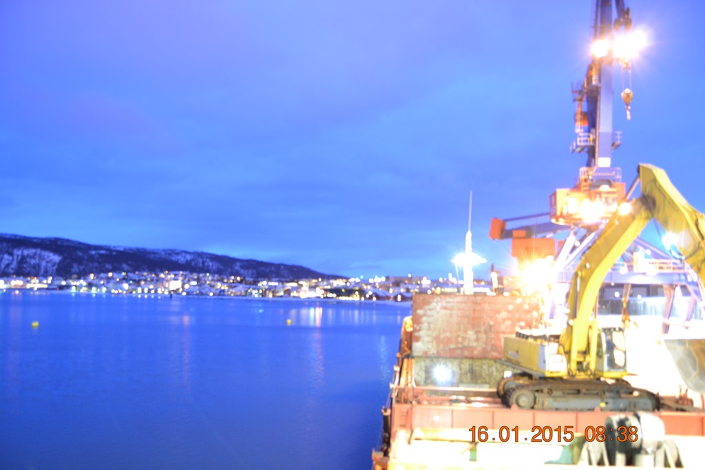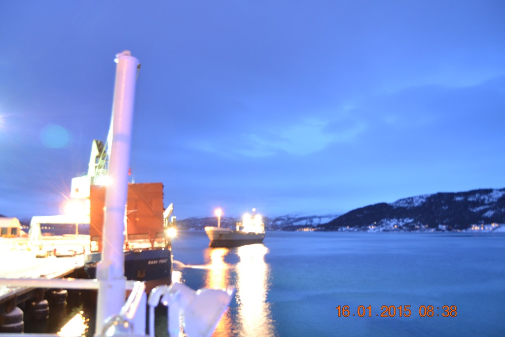 06:30 Väcks av styrman när vi närmar oss Mo i Rana. Går upp och tar båten till kaj.