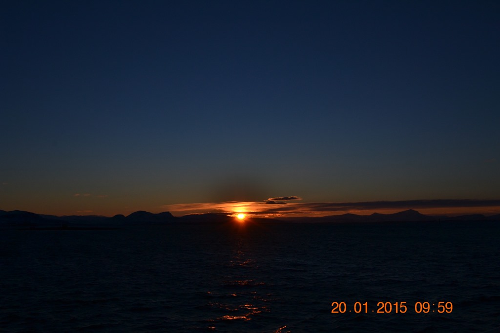 08:00 Kommer på vakt efter Dolmsundet och det blåser fortfarande 10-14 m/s och är –3 grader men klar himmel.