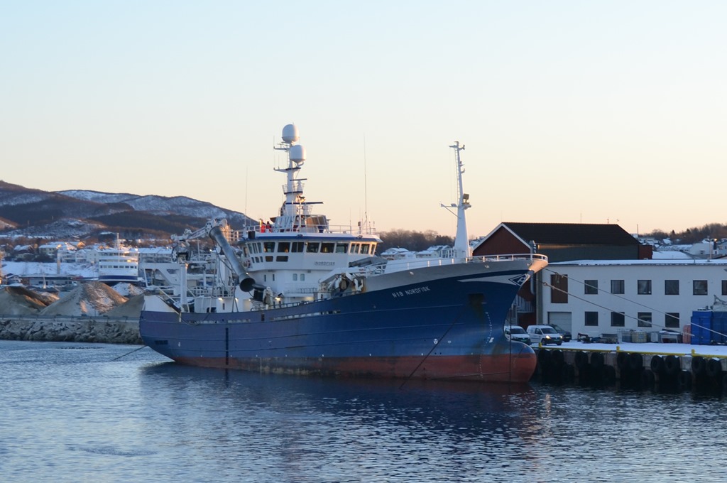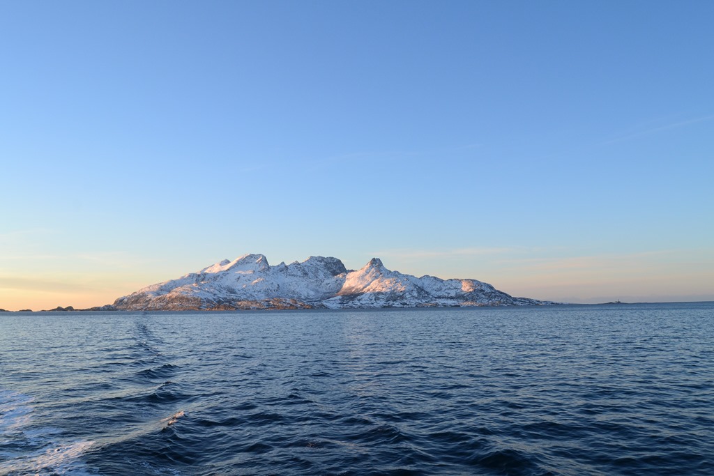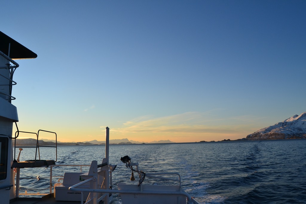 15:45 Går upp på bryggan för att leta upp kajen som vi skall förtöja vid. Det börjar ju mörkna nu och det finns inga ljus inne i fjorden. Hade hoppats någon av lastbilarna skulle ha kommit redan, så man hade haft något att sikta på. Men till slut så ser jag en reflex och några bildäck längs ena bergssidan. Så nu går vi in mot kajen.