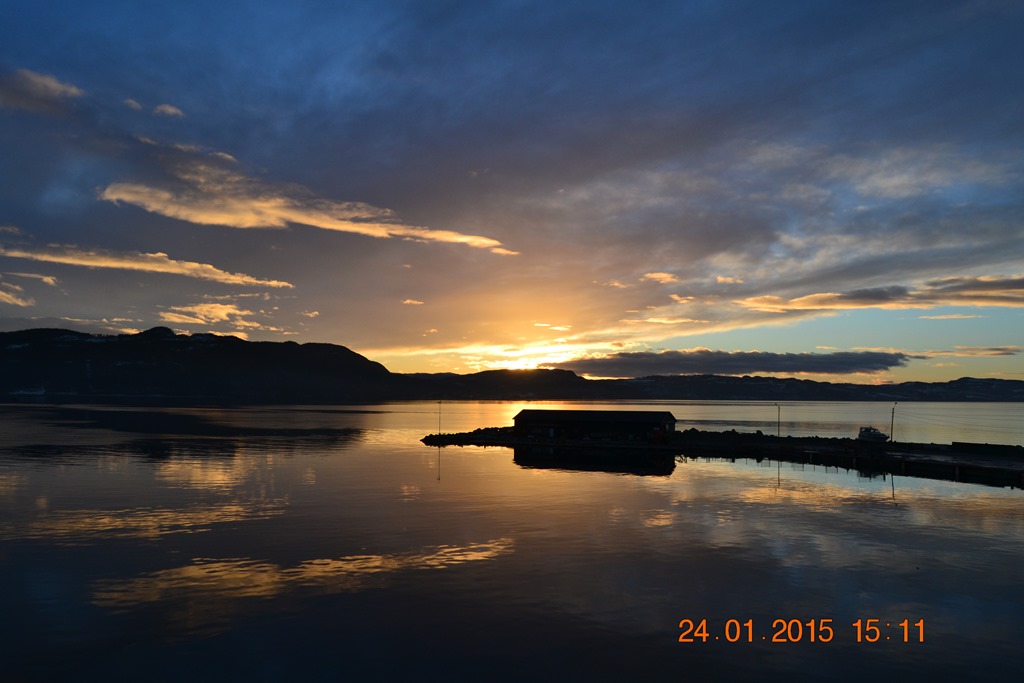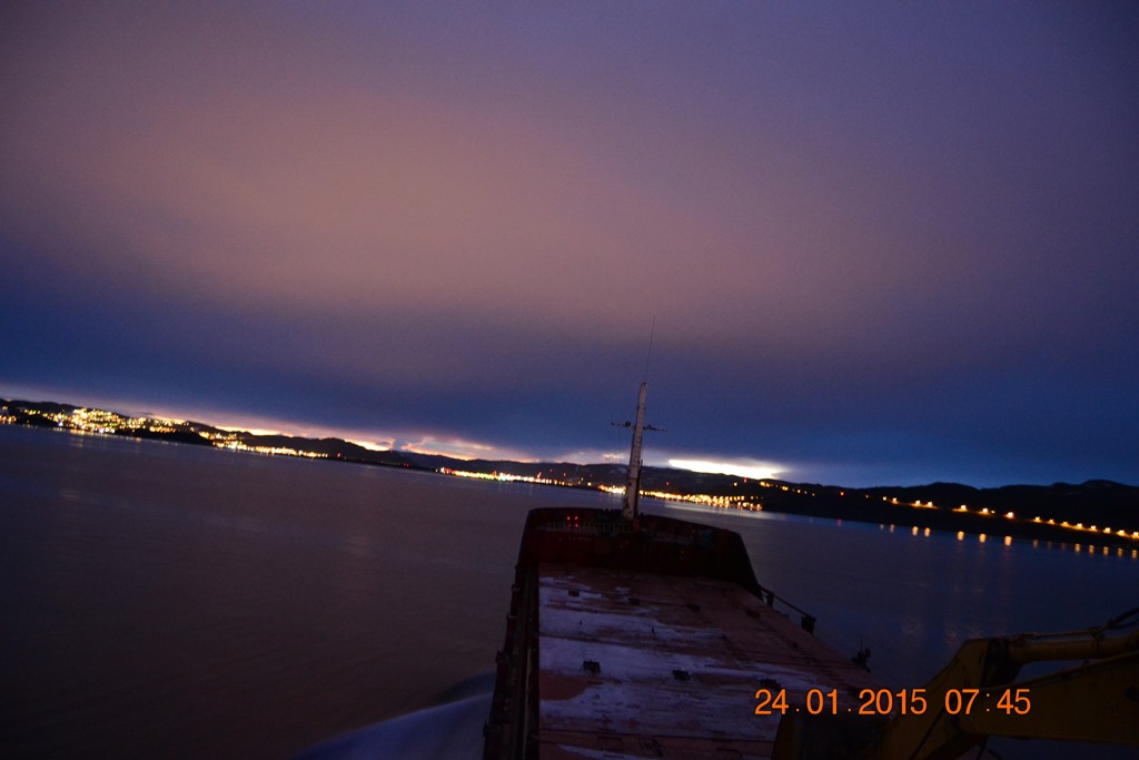 08:15 Förtöjda vid kaj i Stjördal för att lasta 500 ton vägsalt. Vi lastar och sedan gör sig Vadim och Victor klara för att mönstra av. Vid lunchtid så har vi besättningsbyte och då har maskinisten blivit av med sitt bagage, så vi ligger kvar i några timmar till och väntar på det.![]()