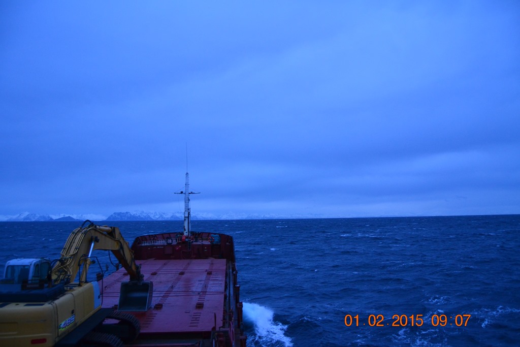 08:00 Kommer på vakt och fortsätter norrut över Vestfjorden. Ostlig vind 5-8 m/s -2 grader.