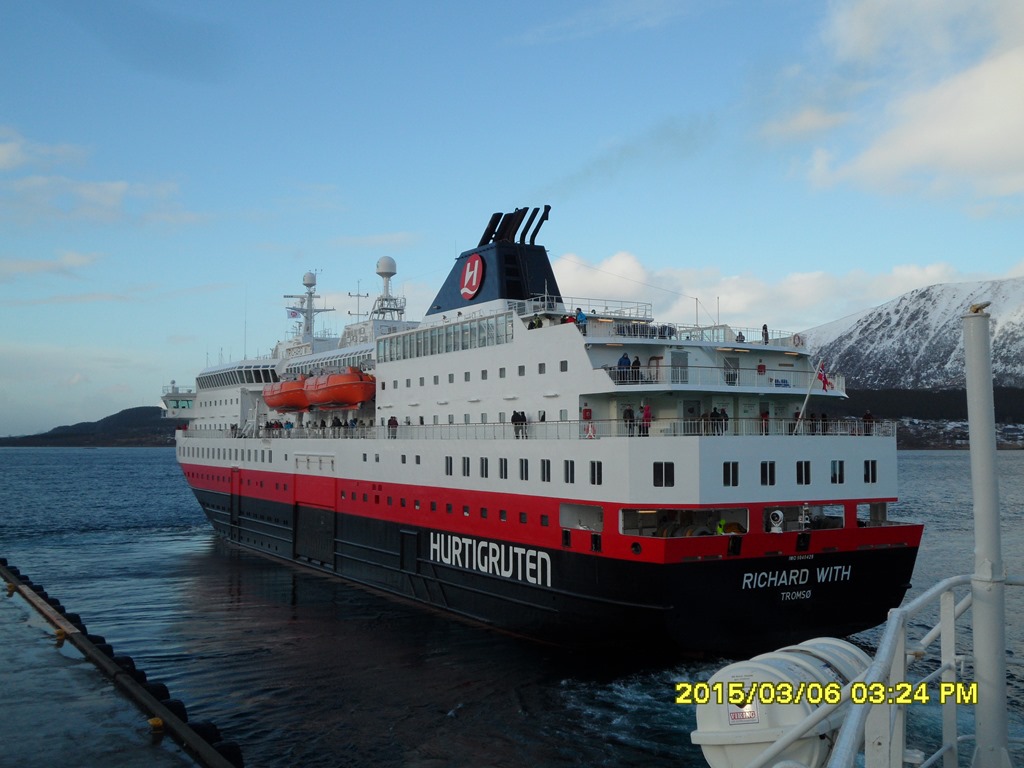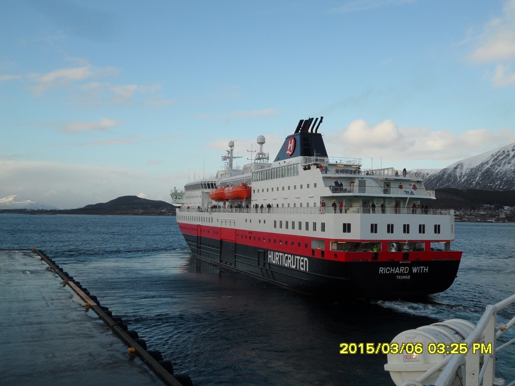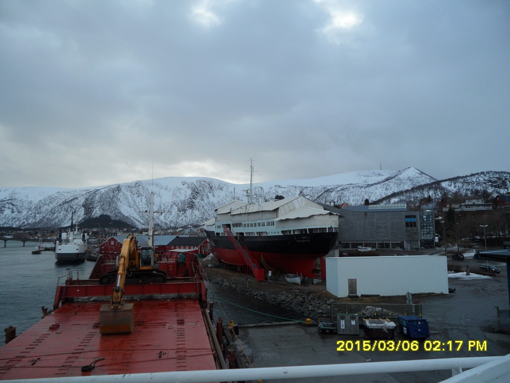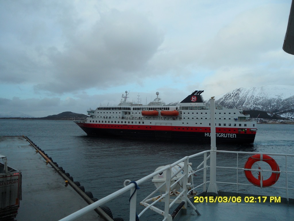 07:20 Förtöjda på Stokmarknes och strax efter kommer reparatörerna som skall fixa bogpropellern. Det tar dem ca 4-5 timmar att sätta ihop allt och nu har vi bogpropeller igen.