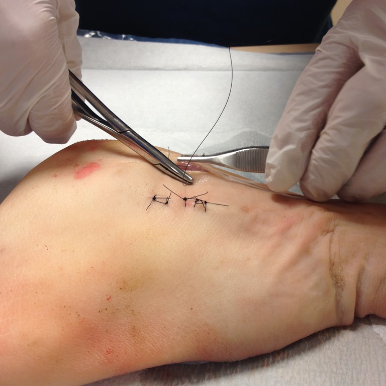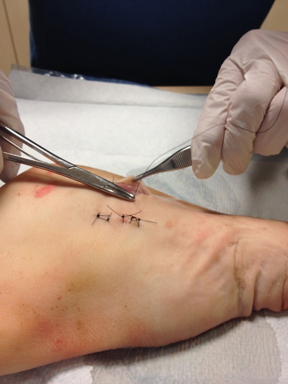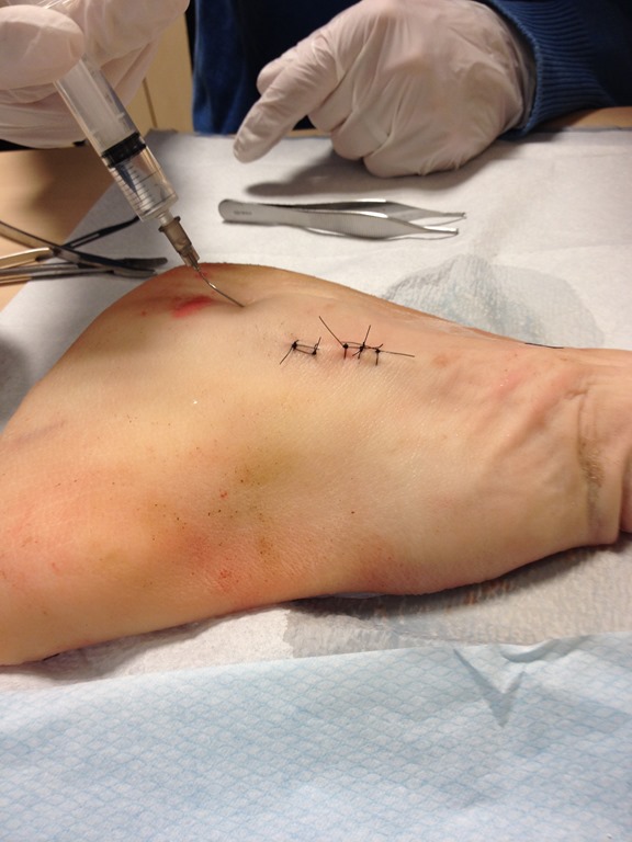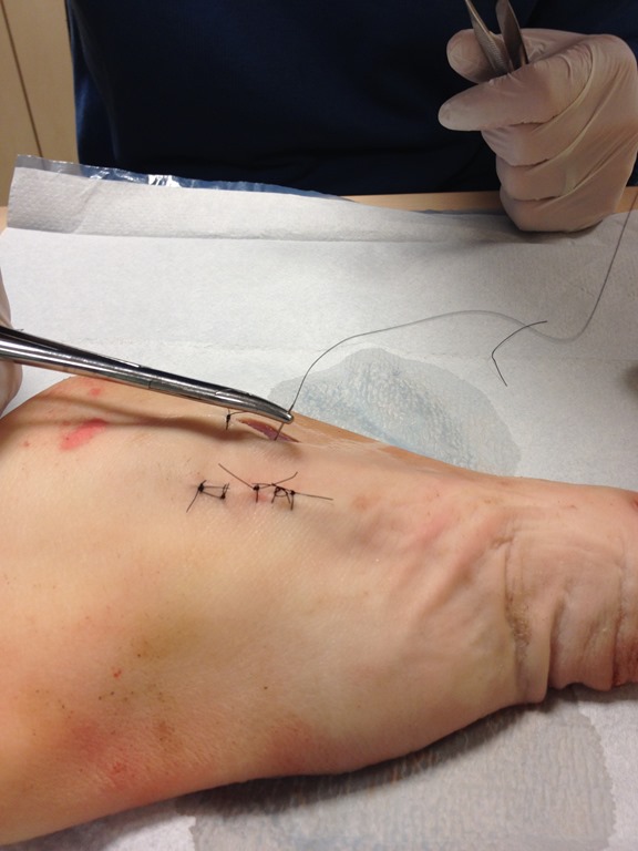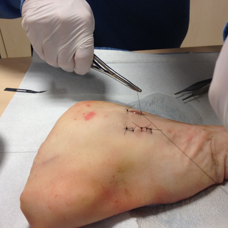 Sista dagen på kurs så började vi med ytterligare lite teori och sedan att ta hand om ben och armbrott. Sätta nackkrage och förflytta skadade personer till bår. På eftermiddagen så började vi med suturering. Vi fick varsin fläsklägg som vi skulle sära sönder och sedan sy ihop.