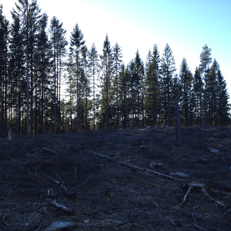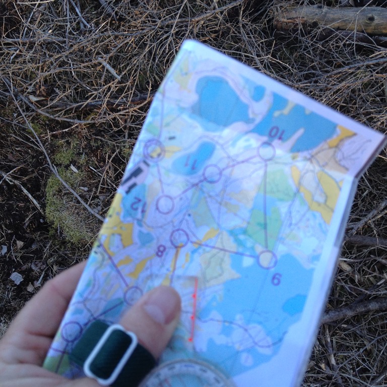 Söderut till den lilla grusvägen och följa den västerut till det öppna fältet. Följa fältet söderut och sedan norrut längs hygget en bit innan jag vek av genom våtmarken fram till släpstigen. Följa den norrut och över hygget upp till höjden där 9:an låg.