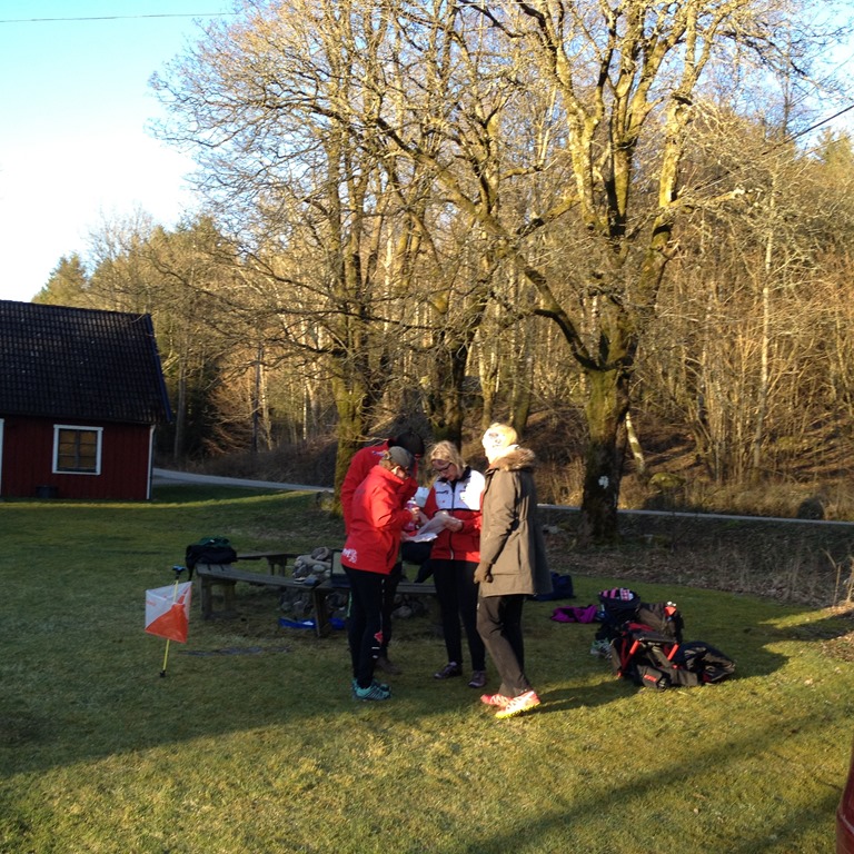 Vi sprang norrut längs vägen till startpunkten och efter gården så vek vi av till vänster längs den lilla grusvägen. Efter svängen på grusvägen så tog vi av till vänster längs släpstigen ner till bäcken. Det var ganska blött så det blev lite fram och tillbaka tills vi kom fram till den lilla höjden efter släpstigen och 1:a kontrollen.