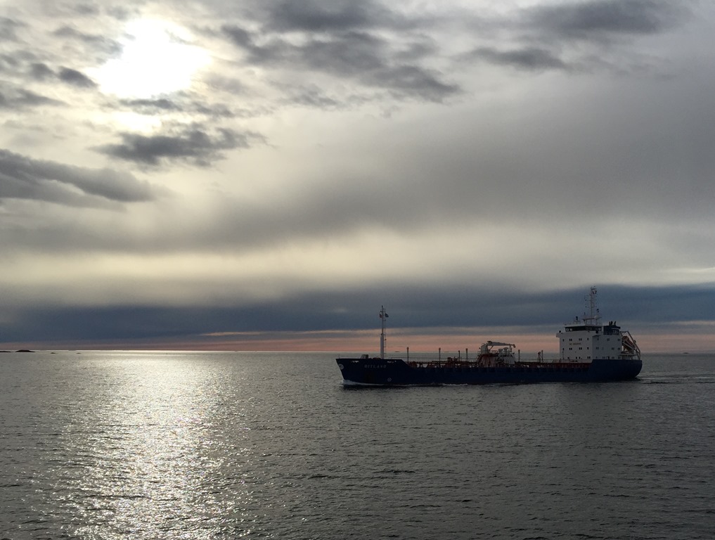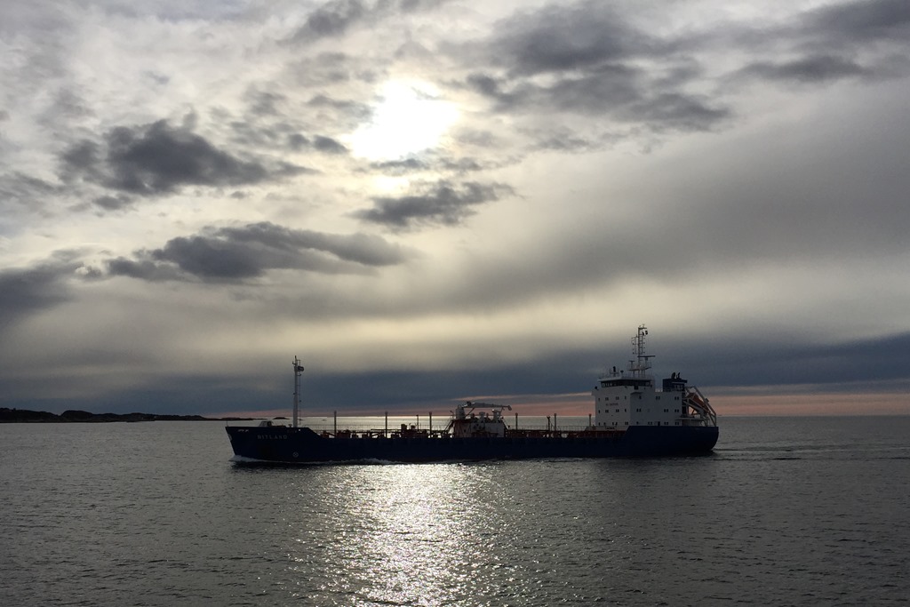 Passerar Staveneset och möter Bitland som är på väg in till Husöy med bitumen.