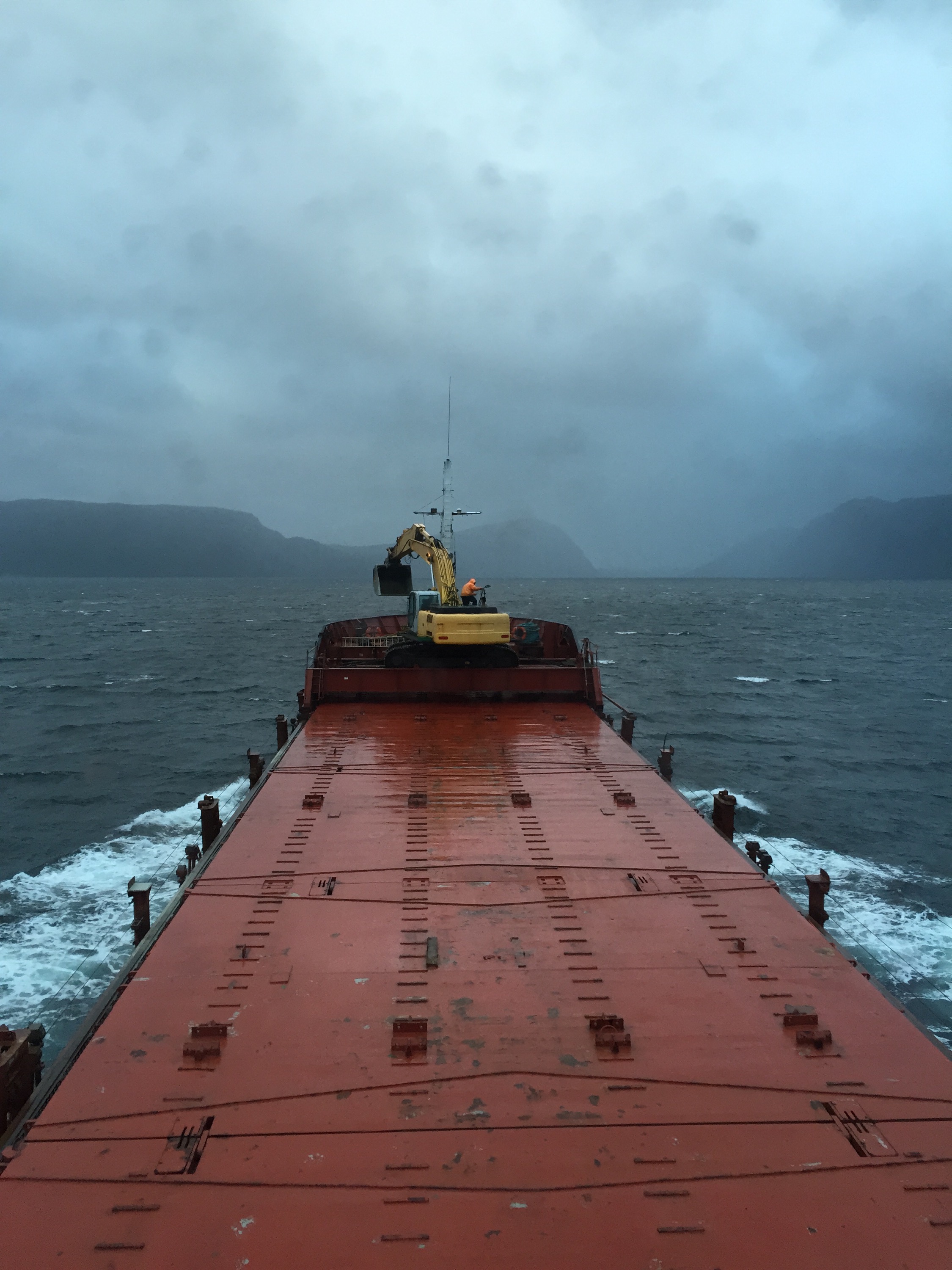 14:00 Kommer på vakt när vi har rundat Stadt. Inte så mycket vind 8-10 m/s men fortfarande lite sjö. Fortsätter in mot Flåværsleia. Får besked att vi skall köra på eftersom det är en annan båt på väg till samma kaj. Så den som kommer först får lossa först.