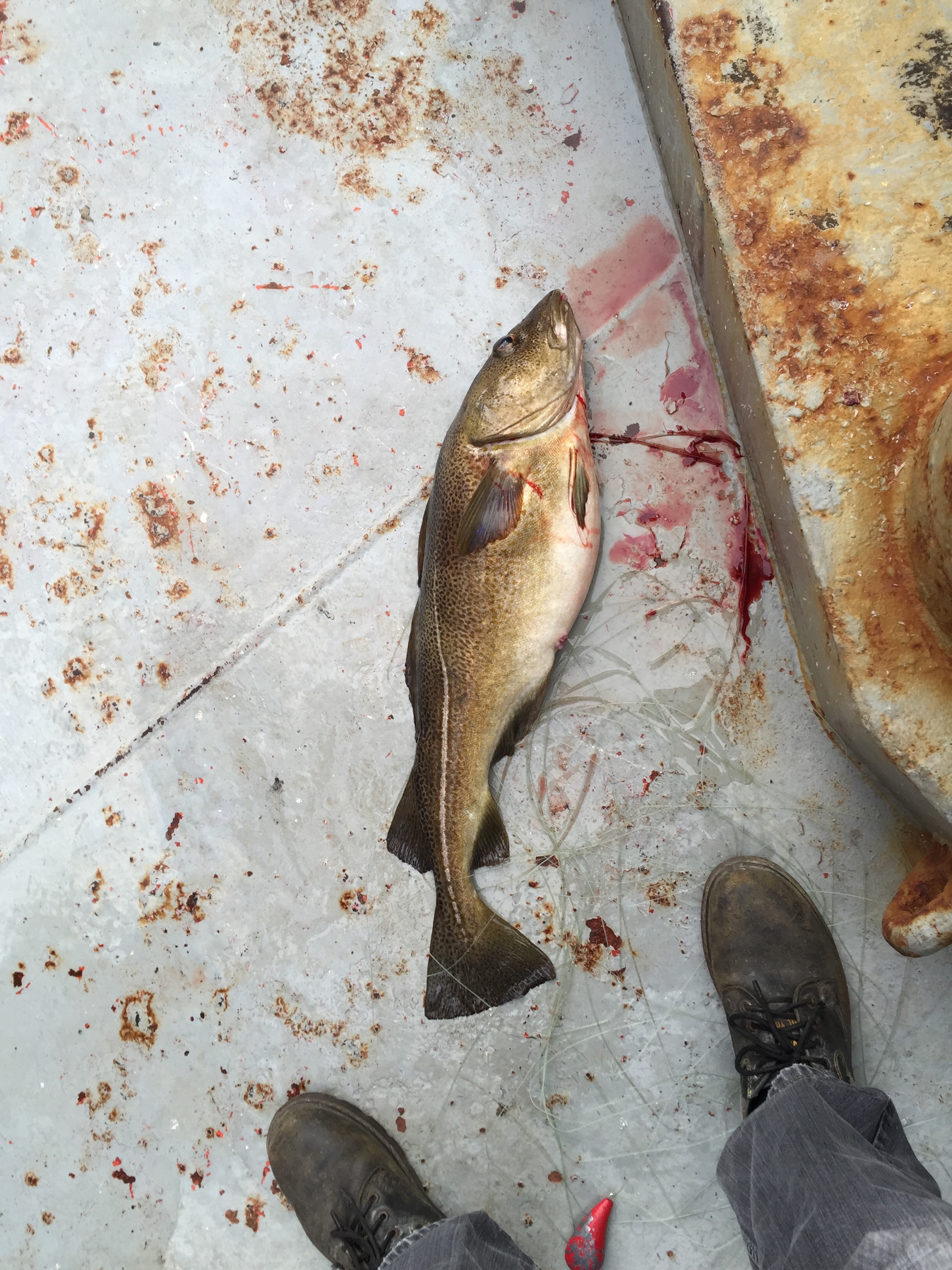 Går ut på däck och fiskar lite. Blir i alla fall en fin torsk.