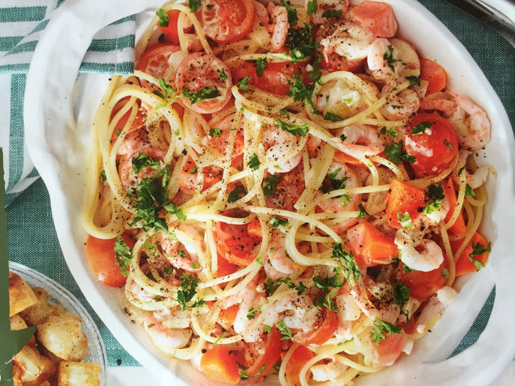 Jag hade förberett maten innan så det var bara pastan kvar att koka innan vi kunde äta räkröra med vitlök, pasta och krutonger.