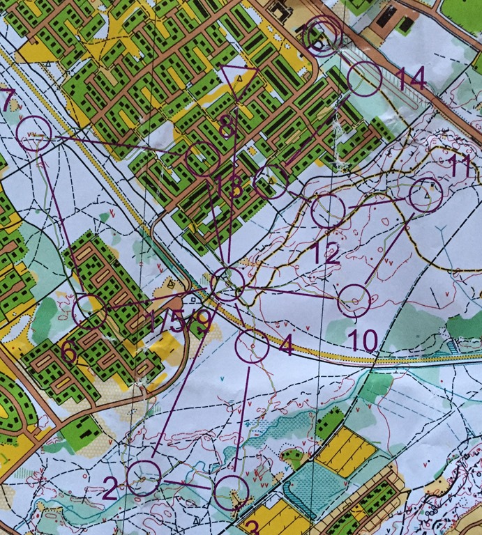 Norrut längs cykelbanan och första stigen in till höger. Följa stigarna norrut till cykelbanan och sedan skulle kontrollen ligga i gropen. Samtidigt kom Anders ikapp mig och vi letade först lite för långt åt öster. Vände västerut och samtidigt kom Amanda och stämplade framför oss.