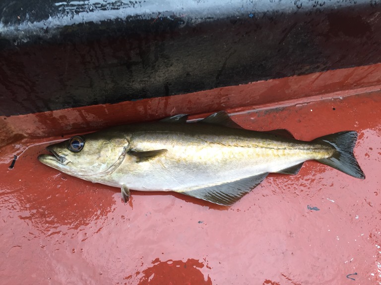 09:00 Förtöjda på Rovde och skall ligga här till imorgon bitti. Regning och disig dag, men jag går ut på däck och fiskar lite. Får många småsejar och två stora Blekor. Men jag släpper i dem igen.