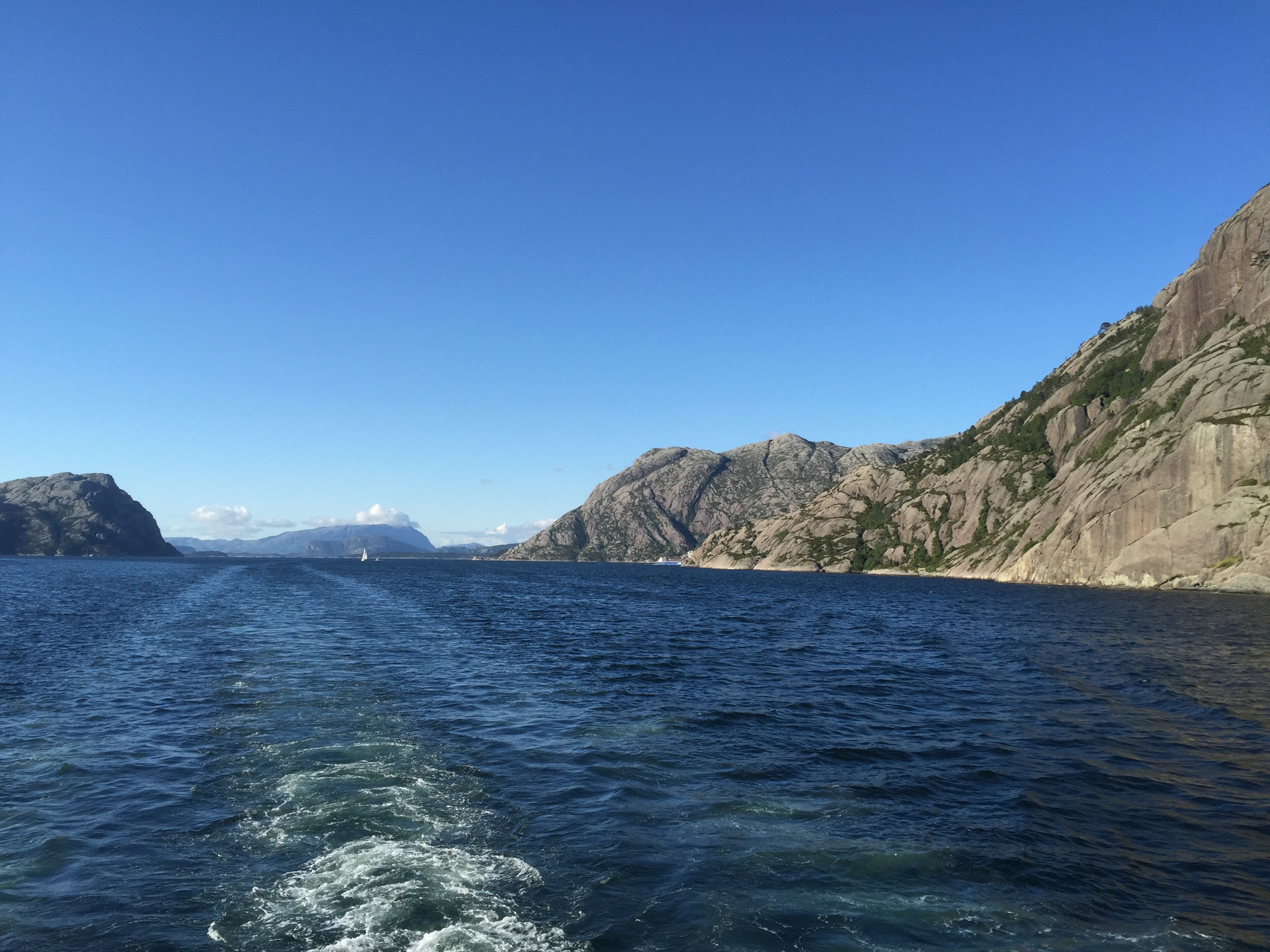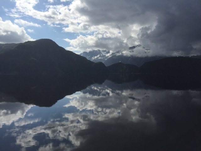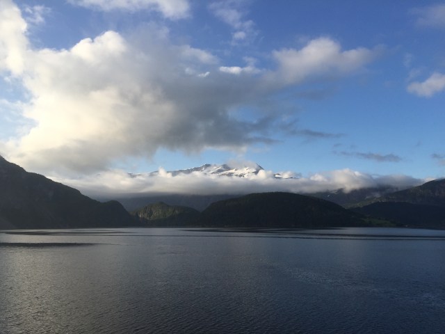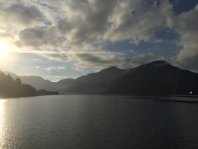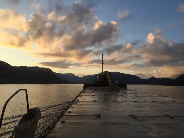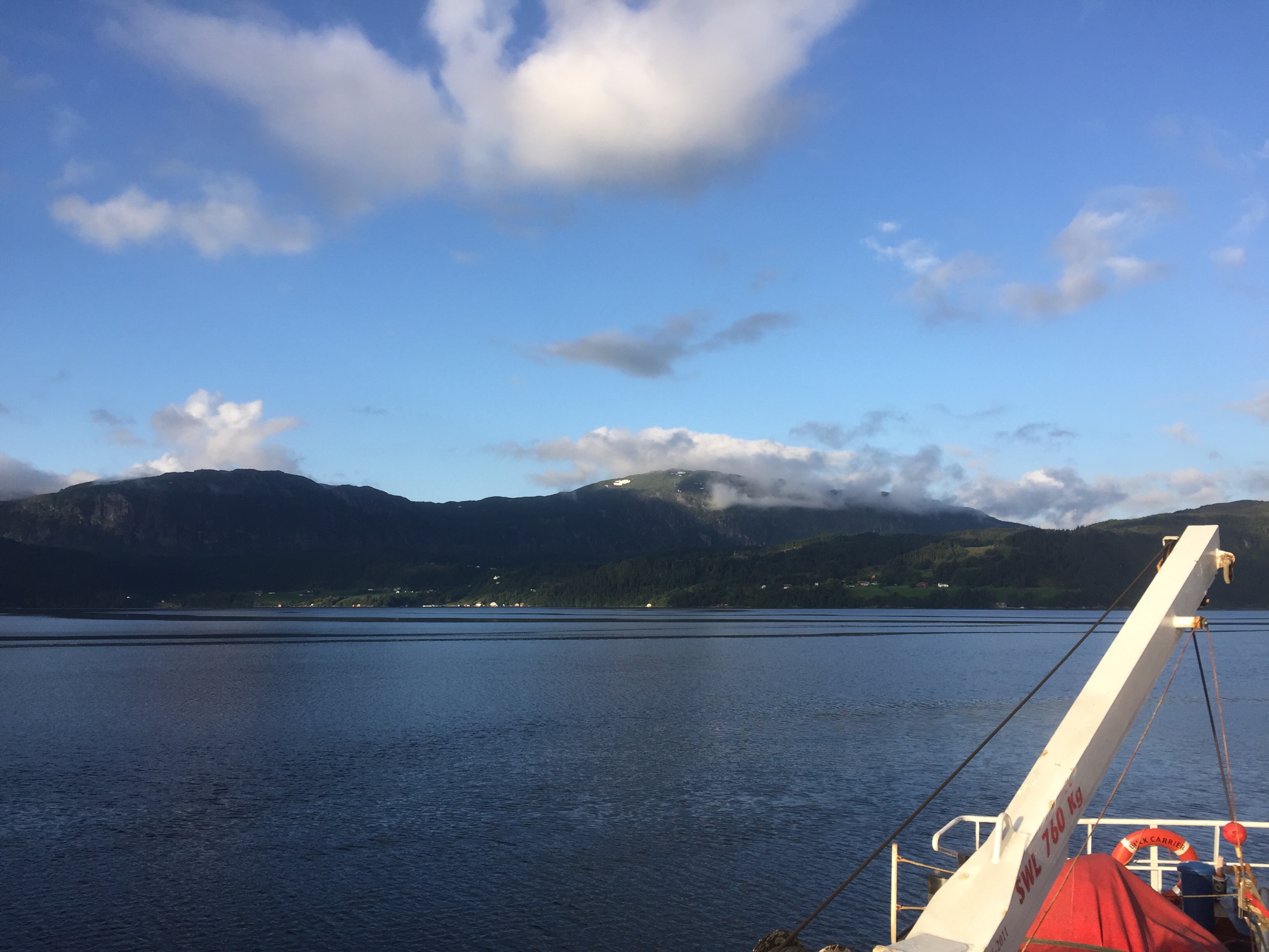 05:00 Vaknar och går upp till styrman och dricker lite kaffe. Riktigt fin morgon i Førdefjorden.