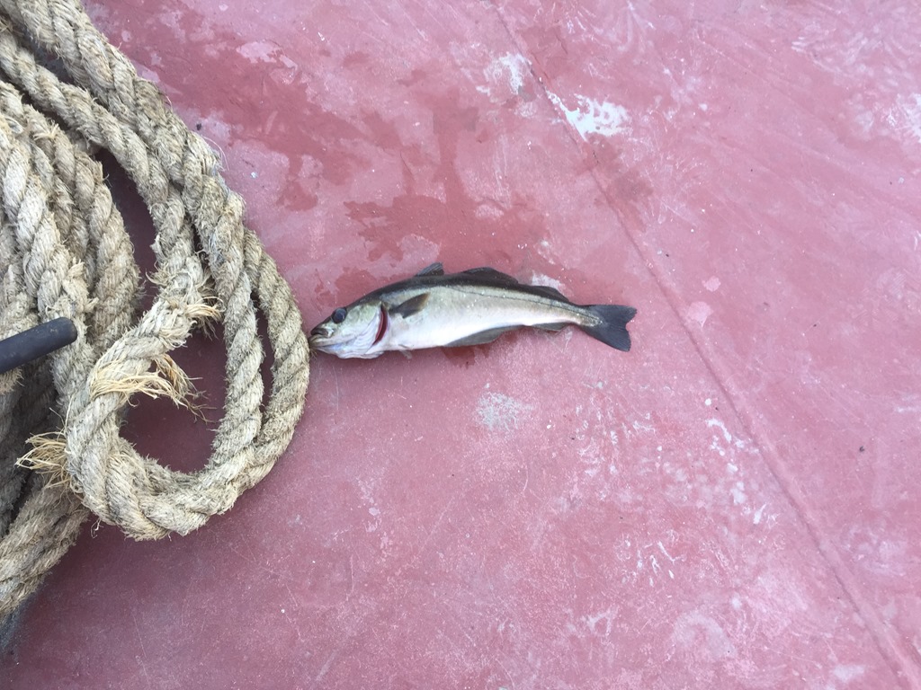 Ställer mig i solskenet på akterdäck och provar fiskelyckan.![]()