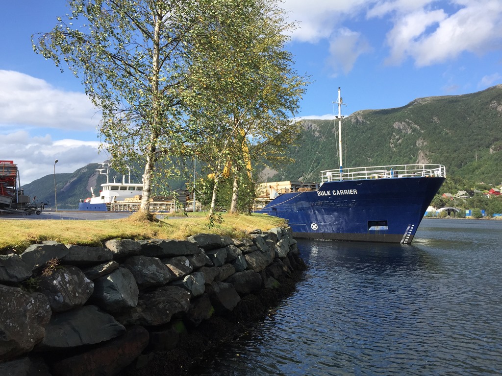 11:05 Förtöjda i Svelgen för lossning. det klarnar upp och blir riktigt fint väder en stund.
