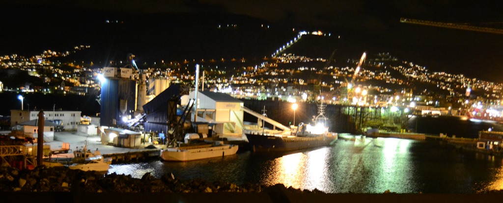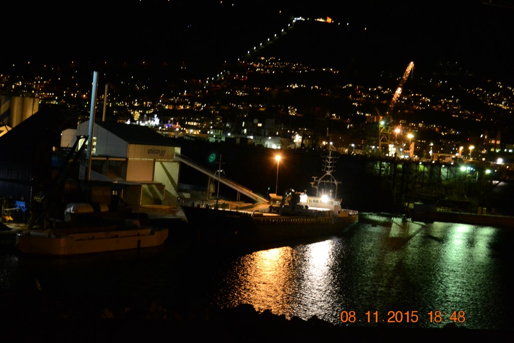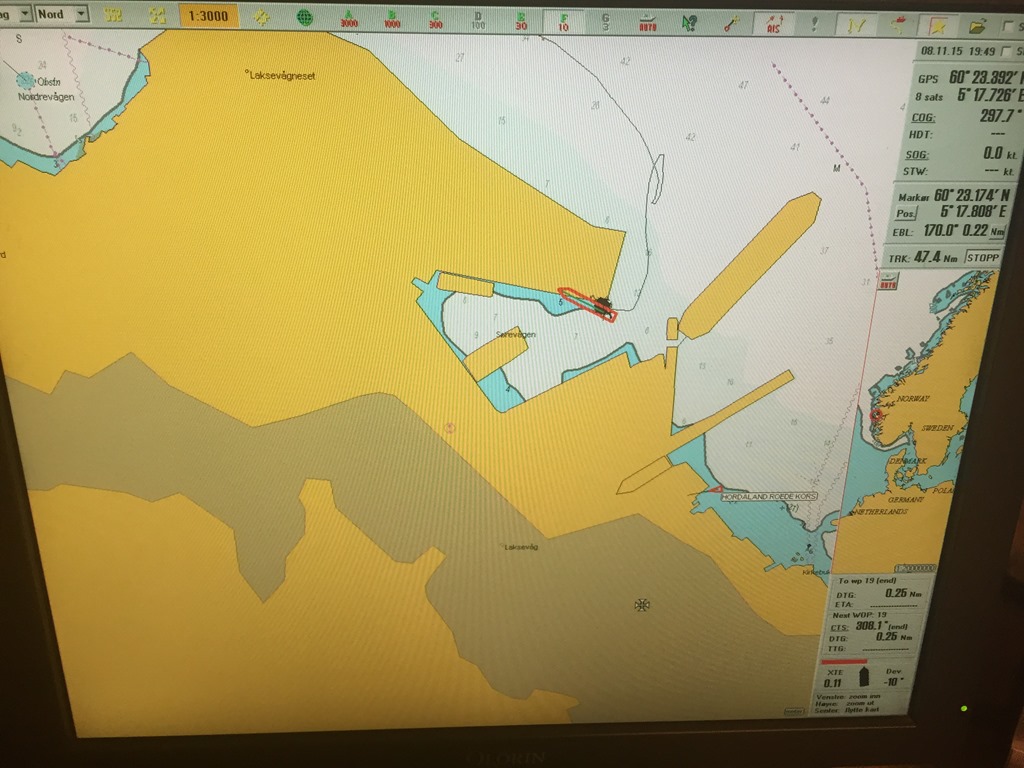 16:30 Går upp på bryggan när jag hör att styrman saktar ner farten. Vi närmar oss Laksevåg men vet inte riktigt vilken kaj vi skall ligga på. Ringer till mäklaren och får till slut luskat ut att vi skall ligga in i en liten hamnbassäng vid varvet. Vi kör sakta in och förtöjer där.![]()