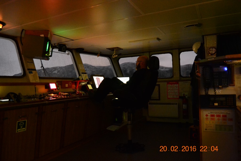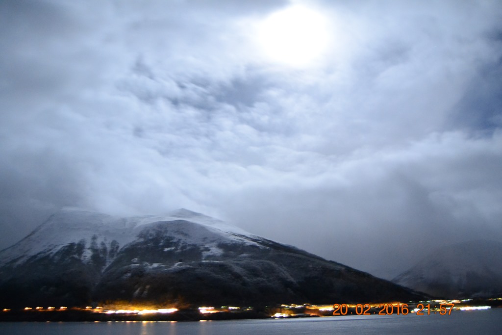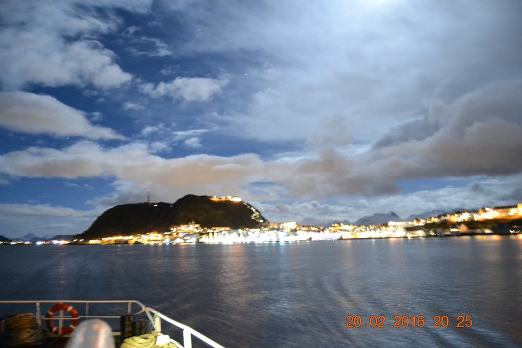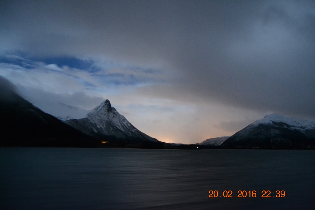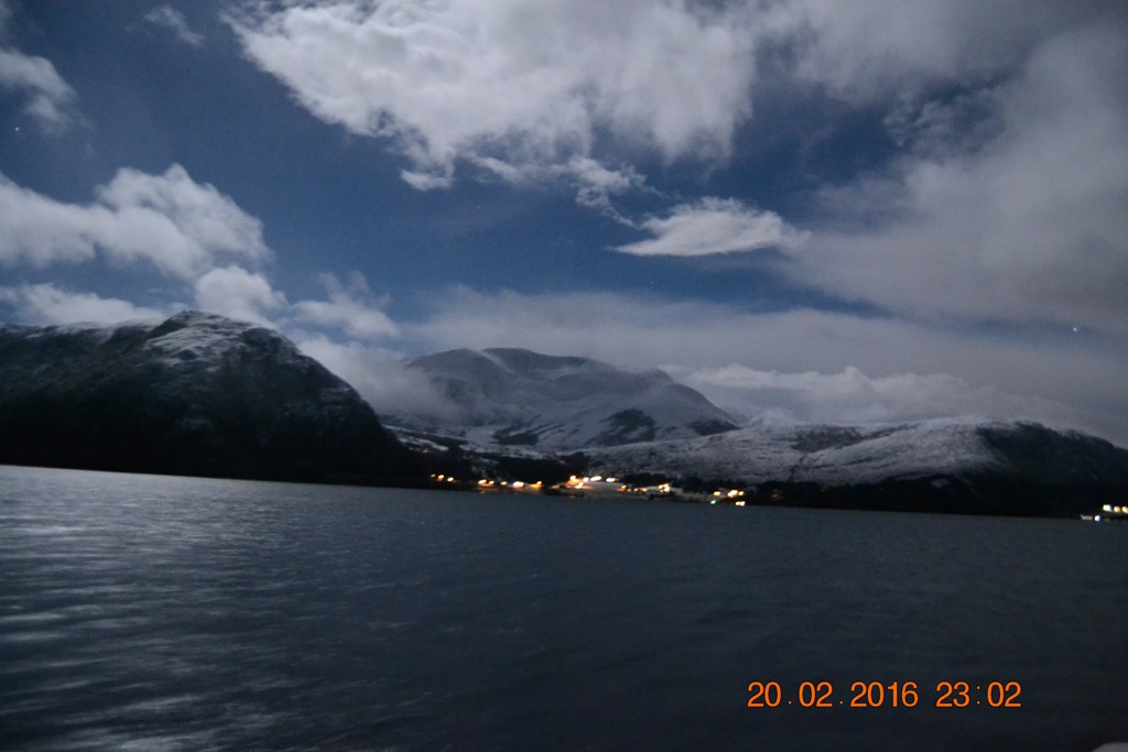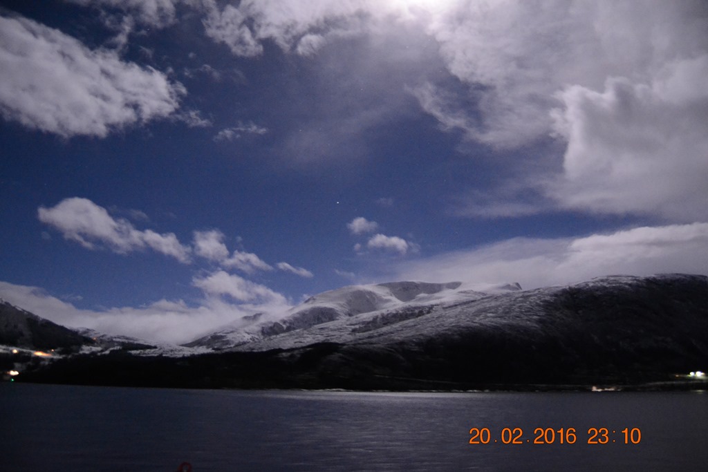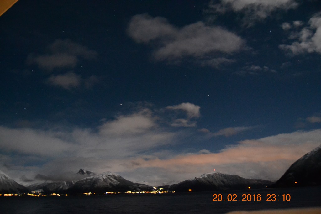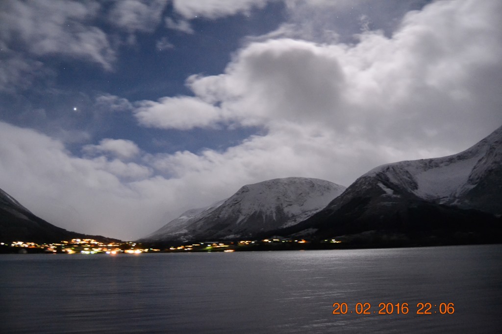 20:10-20:15 Stannar till i Ålesund och lämnar av lärlingen. Fortsätter sedan ner i Storfjorden med växlande väder. Månsken och klart ena stunden och snöfall nästa.![]()
