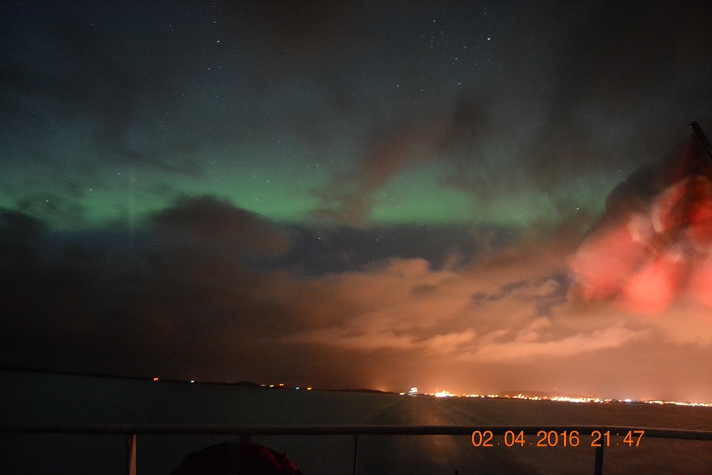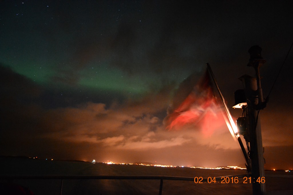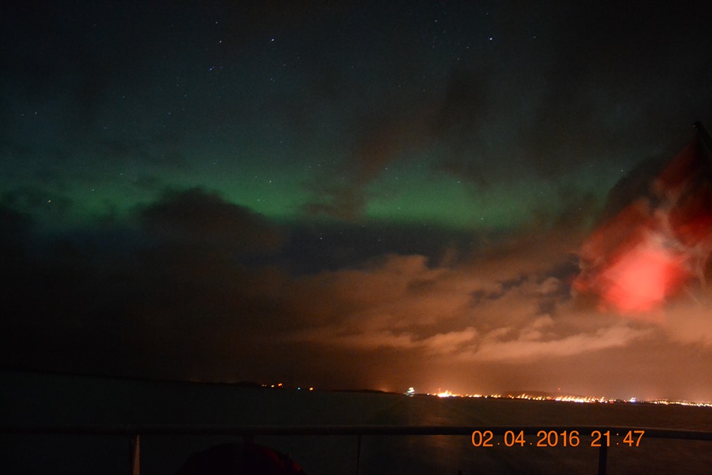 20:00 Kommer på vakt vid Hornelen och fortsätter söderut. Det är norrsken i kväll med molnen och regnet gör att det är svårt att se.![]()