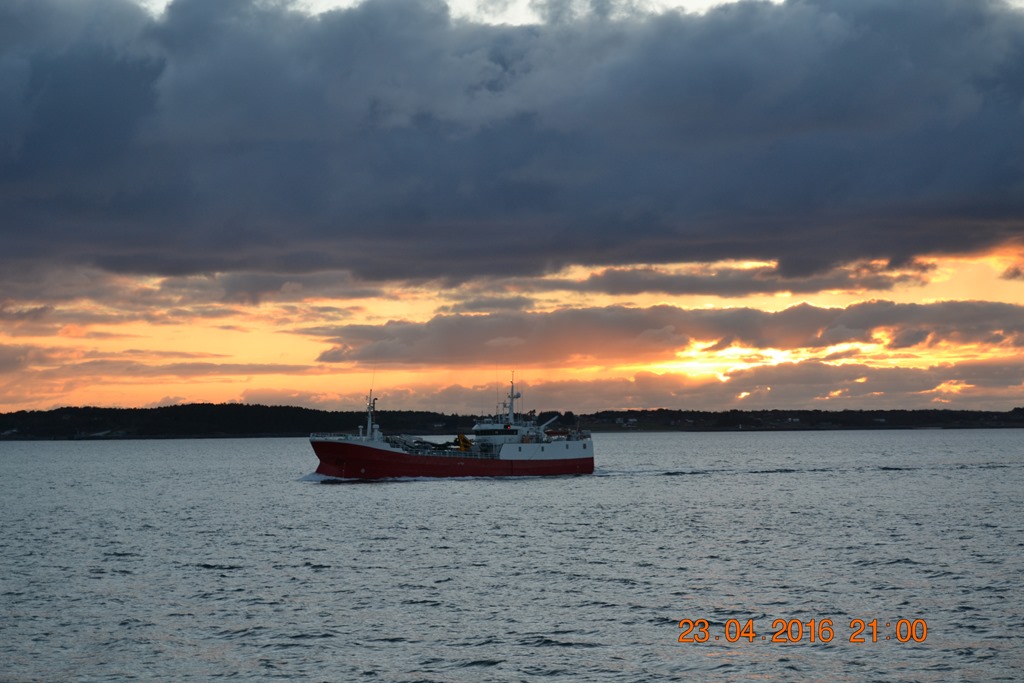 22:35 Förtöjda på Valsneset och börjar lasta fiskfoder i säckar.