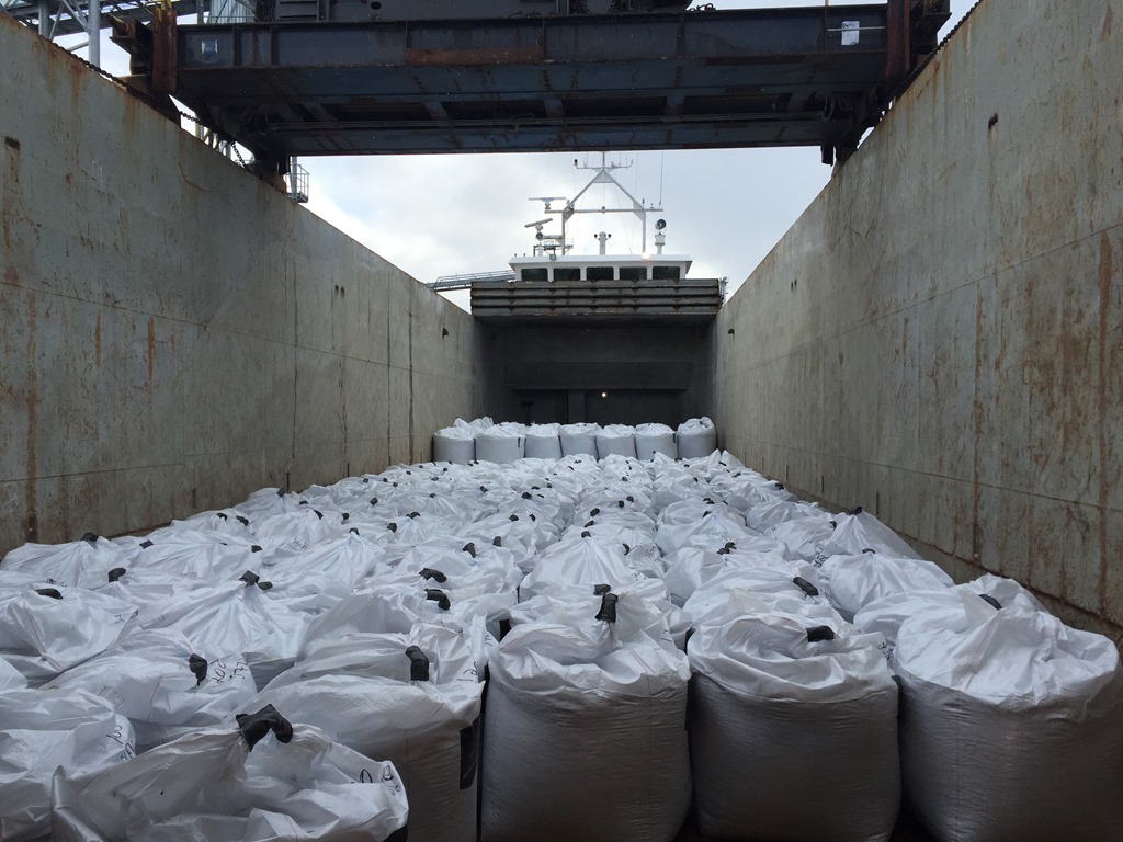 De kan bara producera ca 25 ton i timman så det går inte fort att lasta. Vi låter de fylla på tills det är 45 säckar på kajen innan vi lastar.