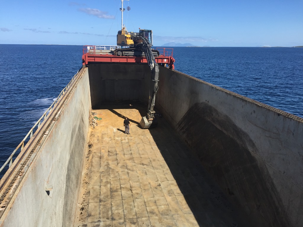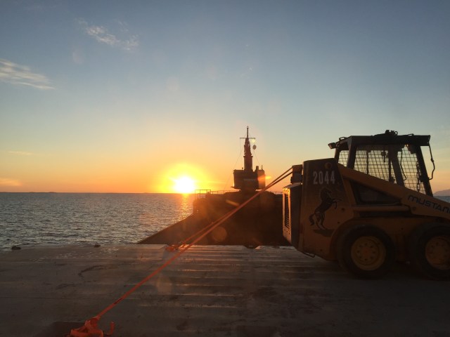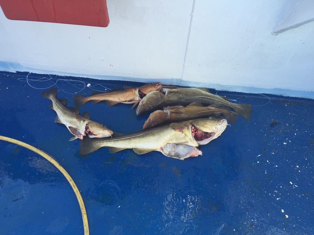 10:00 Ankrar och inväntar lastning. Manskapet gör klart lastrummet för att lasta tång och jag provar fiskelyckan.![]()