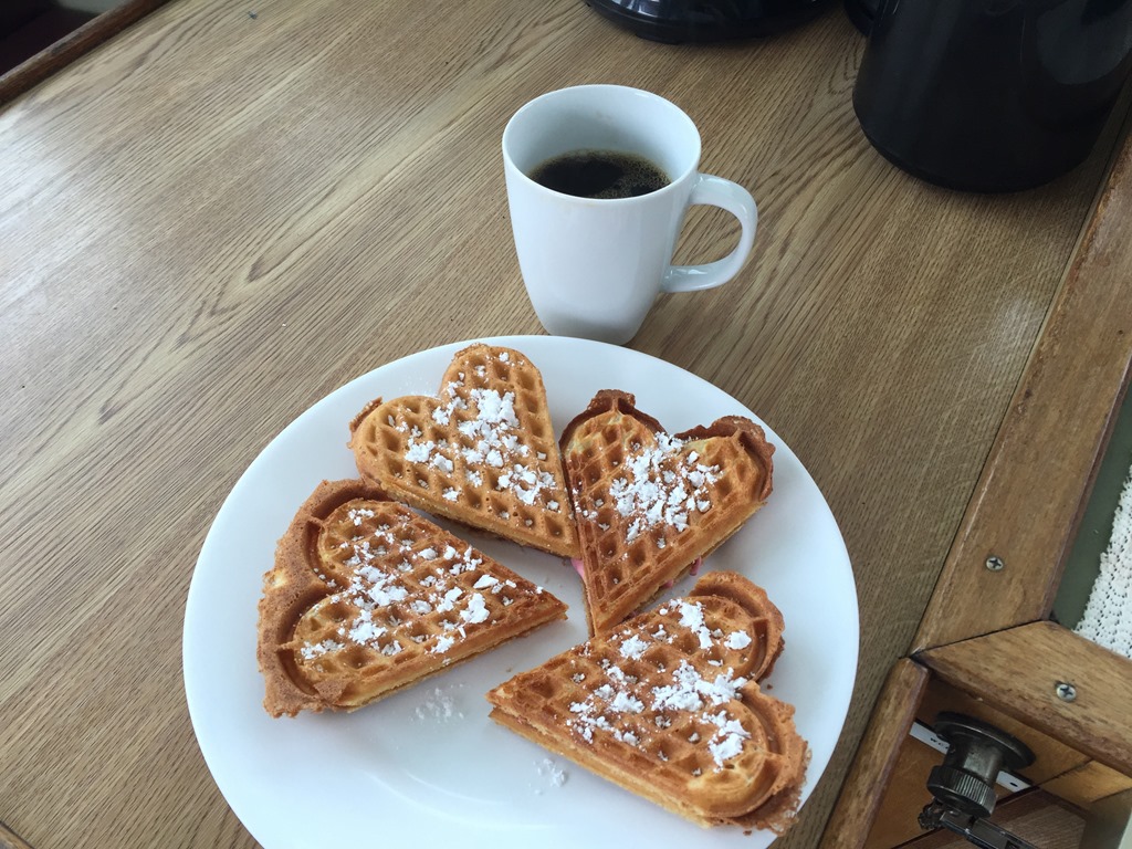 08:00 Kommer på vakt när vi passerat Skatestraumen. Fortsätter söderut och till kaffet kommer Edvard upp med våfflor.