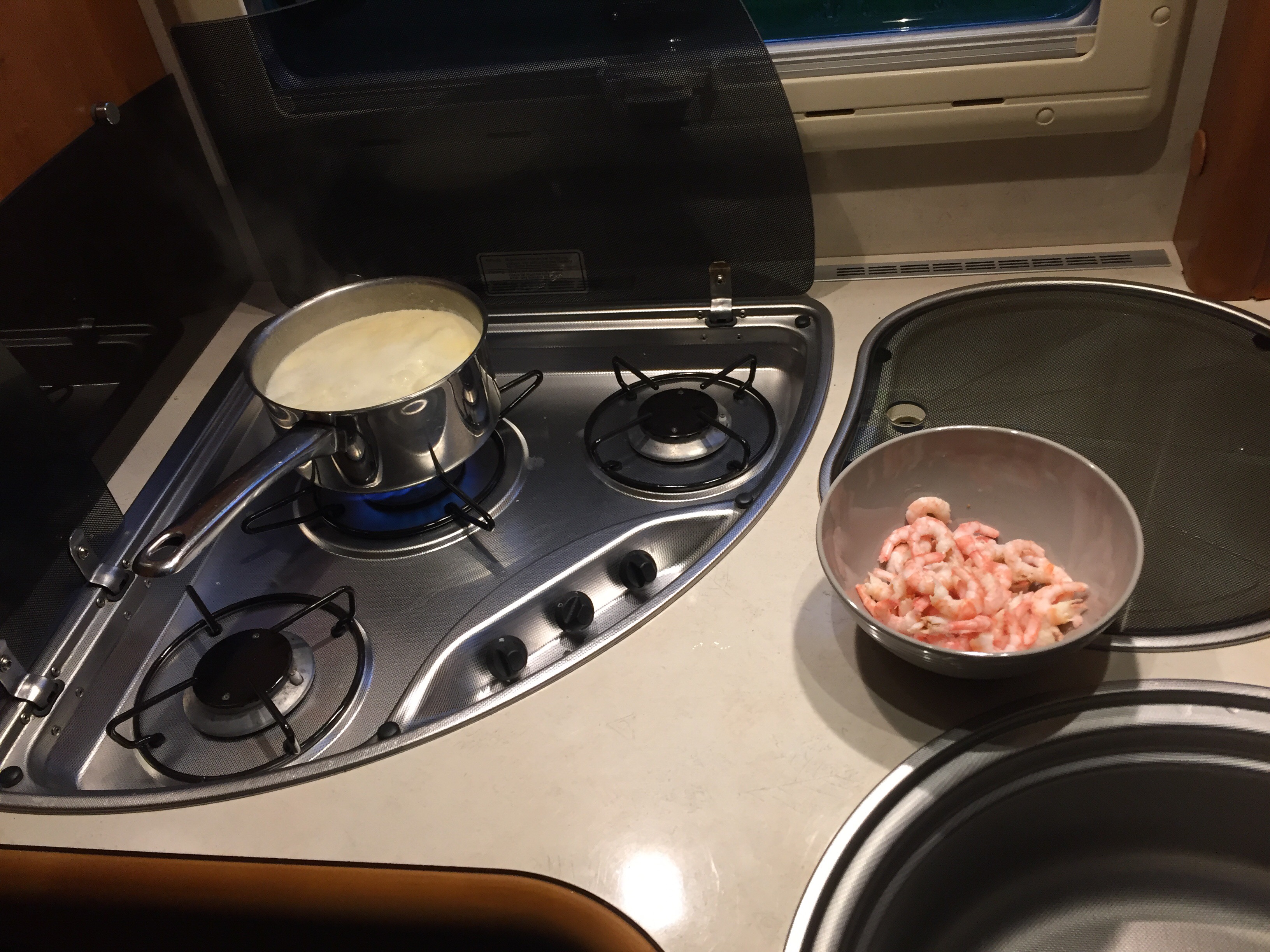 Tillbaka i husbilen så började jag på med middagen. Det blev fisksoppa och vitt vin.